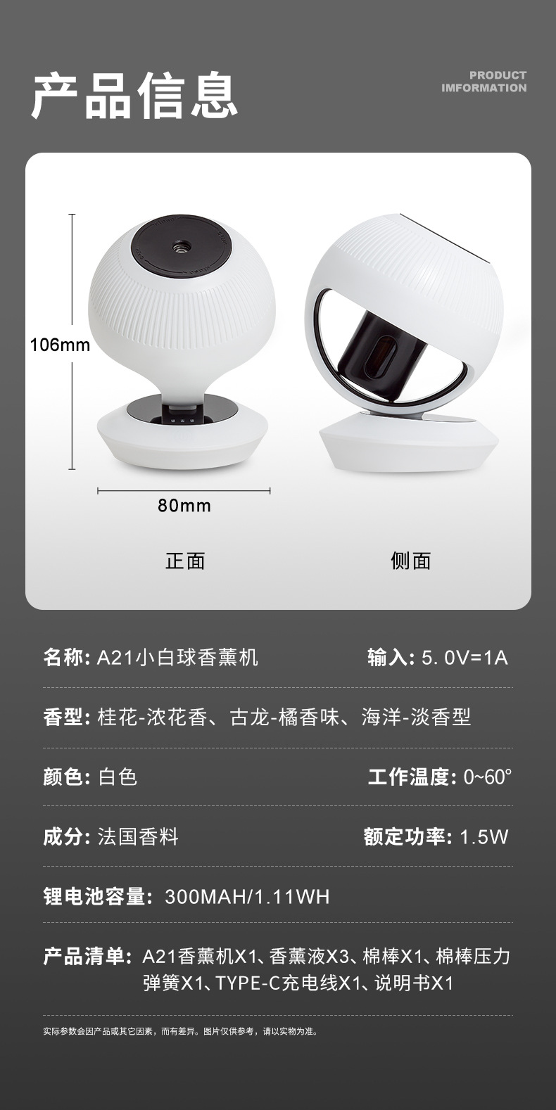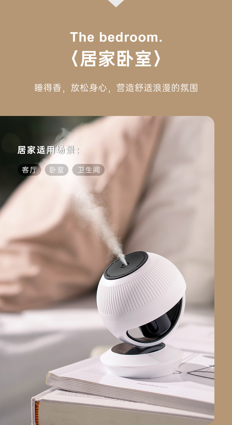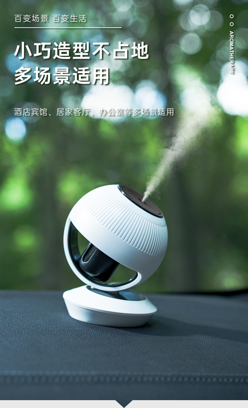 商品属性 [1] Aroma diffuser [2] Rechargeable aromatherapy diffuser [内置蓄电池容量] 100mAh-300mAh(含) [出雾口数] 1个 [功能] 香薰 [噪音] 36-45db [外形] 圆形 [定时功能] 8小时以上 [操作方式] 机械式 [是否内置电池] 内置电池 [是否有定时预约功能] 否 [是否防烧干] 是 [材质] 其它 [款式] 迷你 [水箱容量] 0.5L及以下 [电源方式] USB [类型] 有雾型 [续航时长] 12h以上 [缺水断电保护] 否 [适用场景] 车载,家用 [适用面积] 10㎡以下 [风格] ins风
