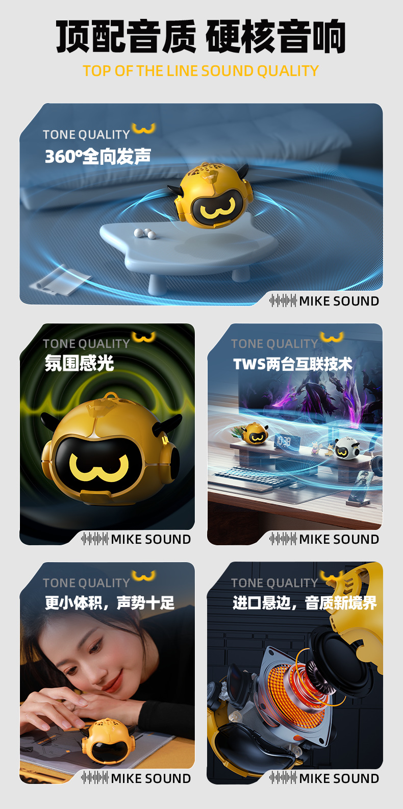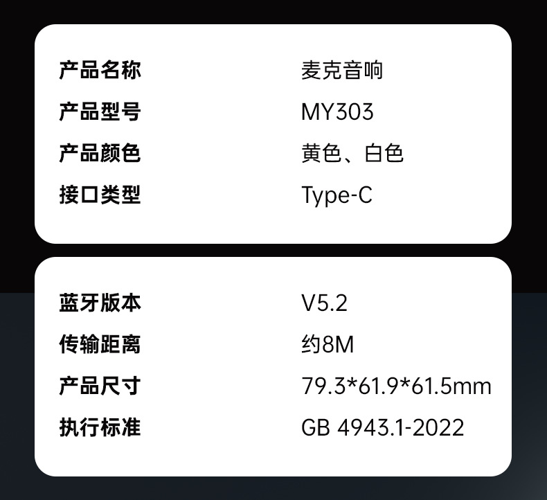 商品属性 [上市时间] 2024/3/22 [主要销售地区] 东南亚,北美,东北亚,中东,拉丁美洲,欧美,其他 [产品净重] 104g [信噪比] ≥95dB [内置蓄电池容量] 800mAh-1000mAh(含) [售后服务] 店铺三包 [喇叭数] 1 [外观尺寸] 79.3*61.9*61.5mm [是否专利货源] 否 [是否内置电池] 内置电池 [是否外贸] 否 [是否跨境出口专供货源] 否 [有效距离] 8m [电源方式] 锂电池 [箱体材质] ABS [蓝牙版本] 5.2 [连接方式] 蓝牙连接 [适用场景] K歌,直播,广场舞,广播系统,户外草坪,其他 [防水等级] 不防水 [附加功能] 通话功能 [频响范围] 20Hz-20KHz [额定功率] 5 [额定电压] 5