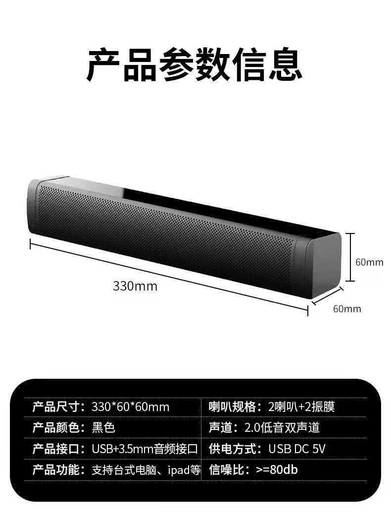 商品属性 [上市时间] 2023 [主要下游平台] 其他 [主要销售地区] 东南亚 [产品净重] 0.5KG [信噪比] ≥75dB [售后服务] 店铺三包 [喇叭数] 2寸喇叭2个 [外观尺寸] 380*280*207 [是否专利货源] 否 [是否内置电池] 无电池 [是否外贸] 是(本商品仅供外贸用途,可能不符合境内产品标准。请境内买家谨慎购入。) [是否跨境出口专供货源] 是 [有效距离] 20米 [电源方式] USB [箱体材质] 塑料 [蓝牙版本] 5.3 [认证类型] CB,ce,其他 [连接方式] 蓝牙连接 [适用场景] 桌面 [防水等级] 不防水 [频响范围] 50Kz-20KHz [额定功率] 10 [额定电压] 5V