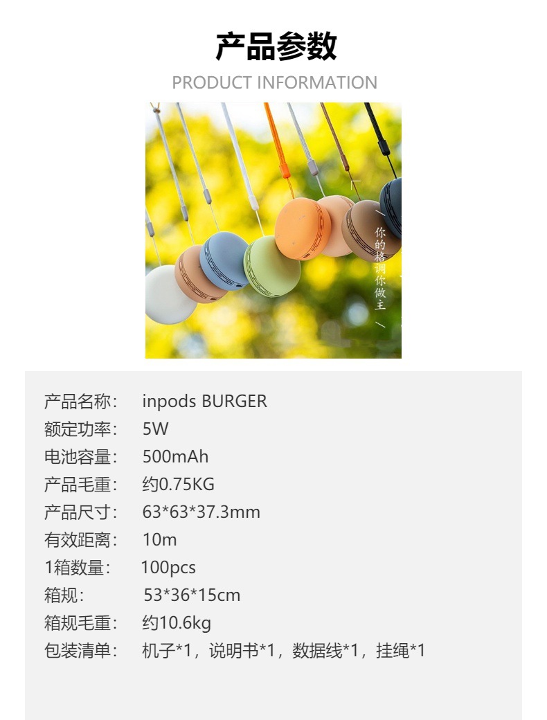 商品属性 [上市时间] 2022 [主要下游平台] ebay,亚马逊,wish,速卖通,独立站,LAZADA [主要销售地区] 日韩,非洲,韩国,日本,欧洲,南美,东南亚,北美,东北亚,中东,拉丁美洲,欧美 [产品净重] 0.75KG [信噪比] ≥75dB [内置蓄电池容量] 300mAh-500mAh(含) [喇叭数] 1个 [外观尺寸] 62.8*62.8*37.3 [是否专利货源] 否 [是否内置电池] 内置电池 [是否跨境出口专供货源] 是 [有效距离] 10m [电源方式] USB [箱体材质] ABS [蓝牙版本] 5.0 [连接方式] 蓝牙连接 [适用场景] 车载,桌面,健身运动,户外,居家,移动便携,K歌,直播,广场舞,广播系统,户外草坪 [防水等级] IPX 2 [附加功能] 语音提示,通话功能,NFC功能 [频响范围] 60Hz-15KHz [额定功率] 5 [额定电压] 5