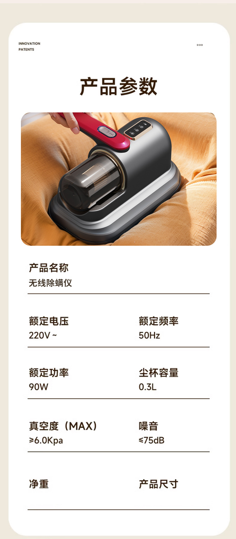 商品属性 [-] 床上除螨 [--] 沙发除螨 [---] 除螨仪 [储尘类型] 尘盒/尘桶 [功能] 其它,静音,紫外线除螨 [吸口宽度] 10-15cm(含) [噪音] 46-70db [尘杯容积] 0.3-0.4L [拍打方式] 触点拍打 [操作方式] 触摸式 [是否有线] 无线 [特殊吸嘴类型] 洁旋风吸尘嘴,除螨刷头,防静电地面刷 [电源线长度] 无线 [额定电压] ≤36V [风格] 复古风,创意风,简约风,北欧风,美式风,ins风