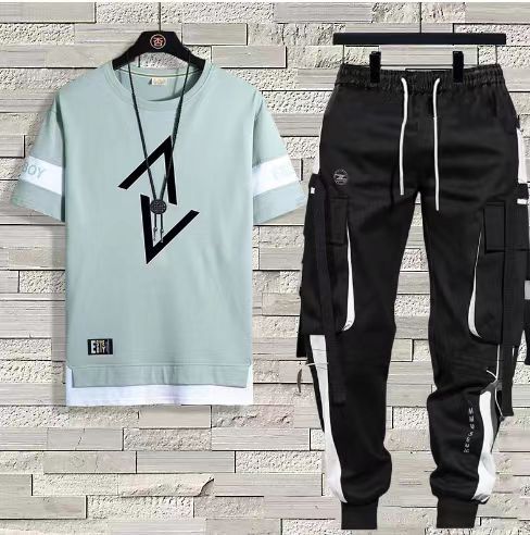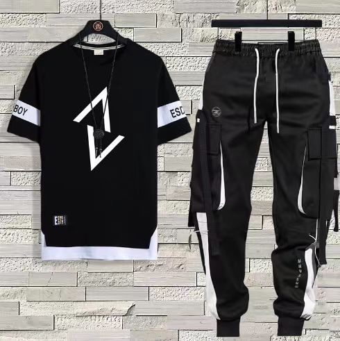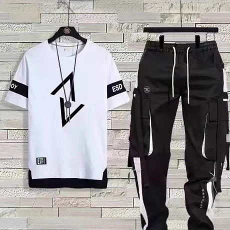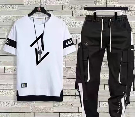 商品属性 [上市年份/季节] 2023年春季 [上衣款式] T恤 [上衣袖长] 短袖 [主面料成分] 聚酯纤维(涤纶) [主面料成分的含量] 100 [厚薄] 薄款 [原创设计货源] 否 [库存类型] 整单 [是否跨境出口专供货源] 否 [是否连帽] 不连帽 [有无质检报告] 否 [淘货类别] 青春流行(18-24岁) [裤长] 长裤 [货源类别] 现货 [质检报告编号] 000 [适合季节] 夏季 [适用场景] 运动 [面料名称] 化纤类混纺 [风格] 运动