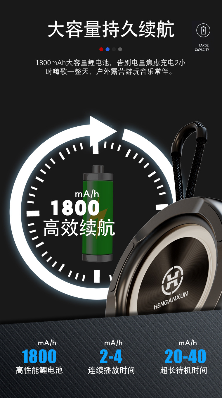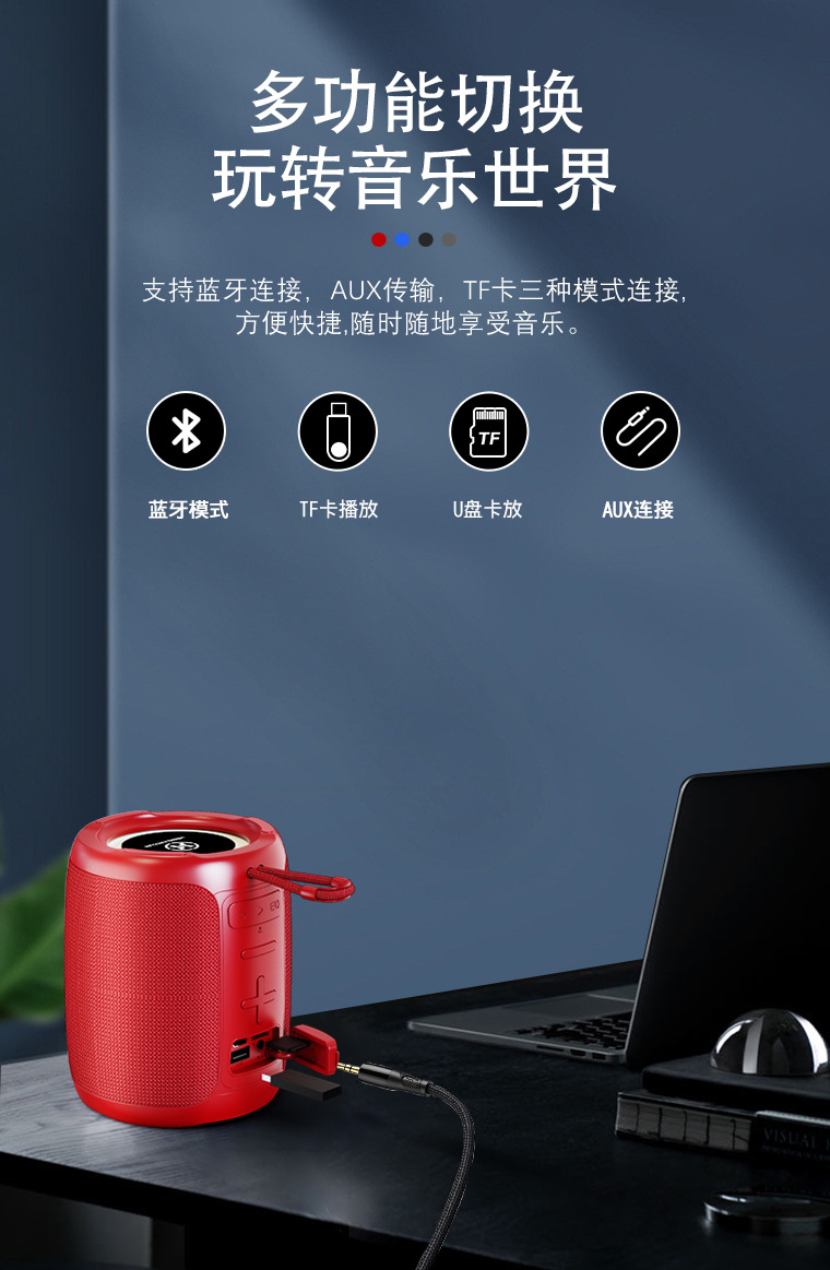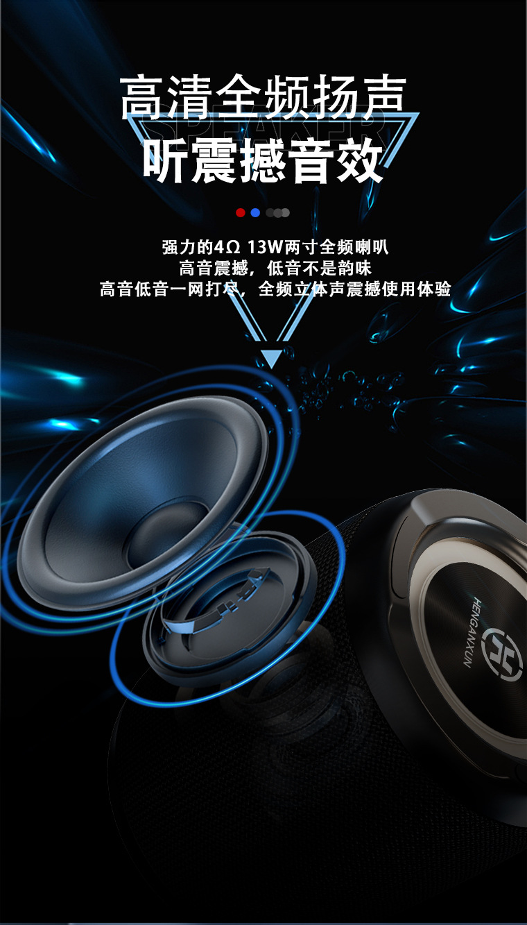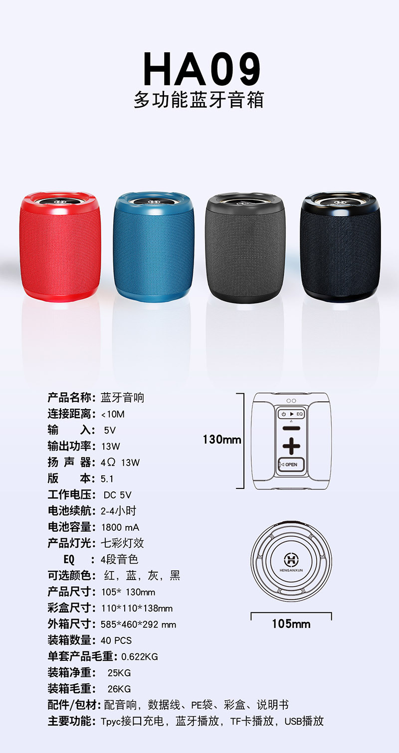 商品属性 [EQ模式] 可调4种EQ模式 [上市时间] 2024 [主要下游平台] wish,速卖通,独立站,LAZADA,其他 [主要销售地区] 日韩,非洲,韩国,日本,欧洲,南美,东南亚,北美,东北亚,中东,拉丁美洲,欧美 [产品净重] 400 [信噪比] ≥75dB [内置蓄电池容量] 1200mAh-2000mAh(含) [售后服务] 店铺三包 [喇叭数] 1 [外观尺寸] 105*130 [是否专利货源] 否 [是否内置电池] 内置电池 [是否外贸] 是(本商品仅供外贸用途,可能不符合境内产品标准。请境内买家谨慎购入。) [是否跨境出口专供货源] 是 [有效距离] 15米 [电源方式] USB [箱体材质] 塑料 [英文名] wireless speaker with EQ adjustable [蓝牙版本] 5.1 [认证类型] ce,ROHS [连接方式] 蓝牙连接 [适用场景] 健身运动,户外,居家,移动便携,K歌,直播,广场舞,广播系统,户外草坪,其他 [防水等级] IPX 4 [附加功能] 插卡 [频响范围] 20Hz-20KHz [额定功率] 13 [额定电压] 5