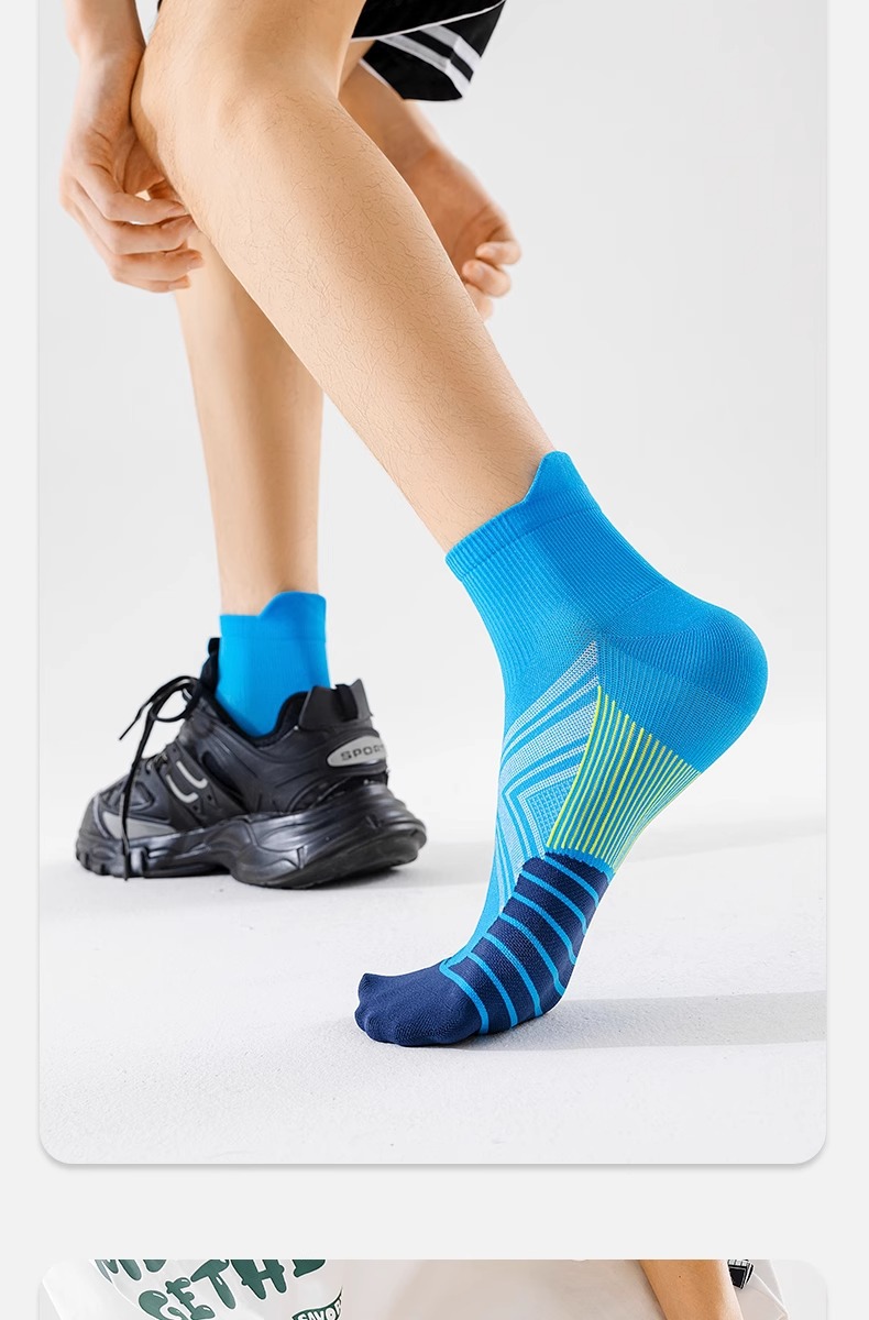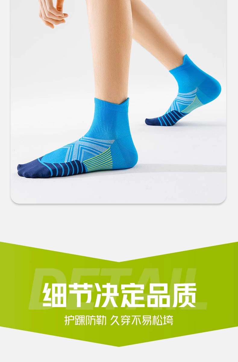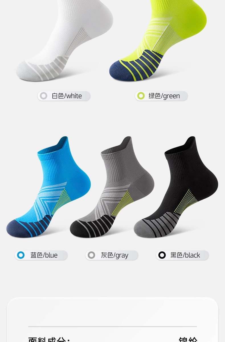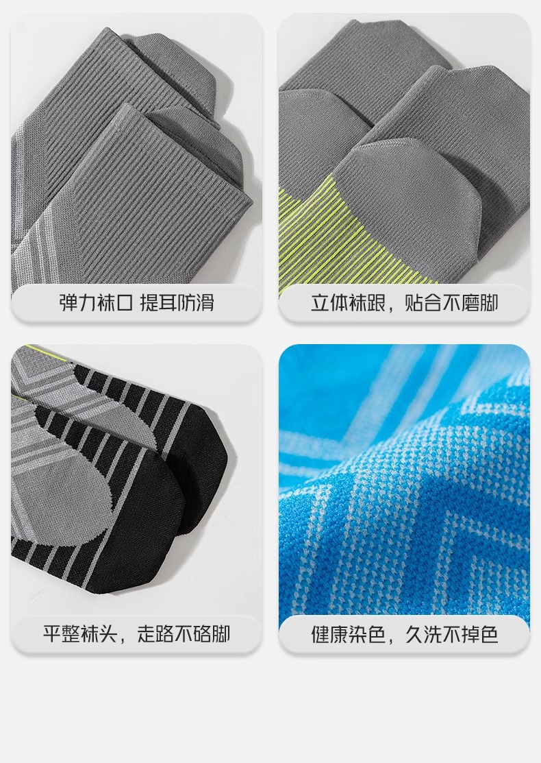 商品属性 [上市年份/季节] 2024春季 [上市时间] 2023年夏季 [主面料成分] 锦纶 [主面料成分含量] 80%(含)-90%(不含) [产品类别] 专业运动袜 [产地] 嘉兴 [功能] 吸汗,防摩擦 [包装形式] 袋装 [图案] 拼色 [成分及含量] 85 [无骨缝制] 是:手工无骨缝头 [是否跨境出口专供货源] 是 [是否进口] 否 [筒高] 短筒 [织造方法] 单针 [适合季节] 四季通用 [适用场景] 跑步 [适用年龄段] 青年(18-40周岁) [适用性别] 男 [针数] 200N [面料名称] 锦纶 [风格] 运动