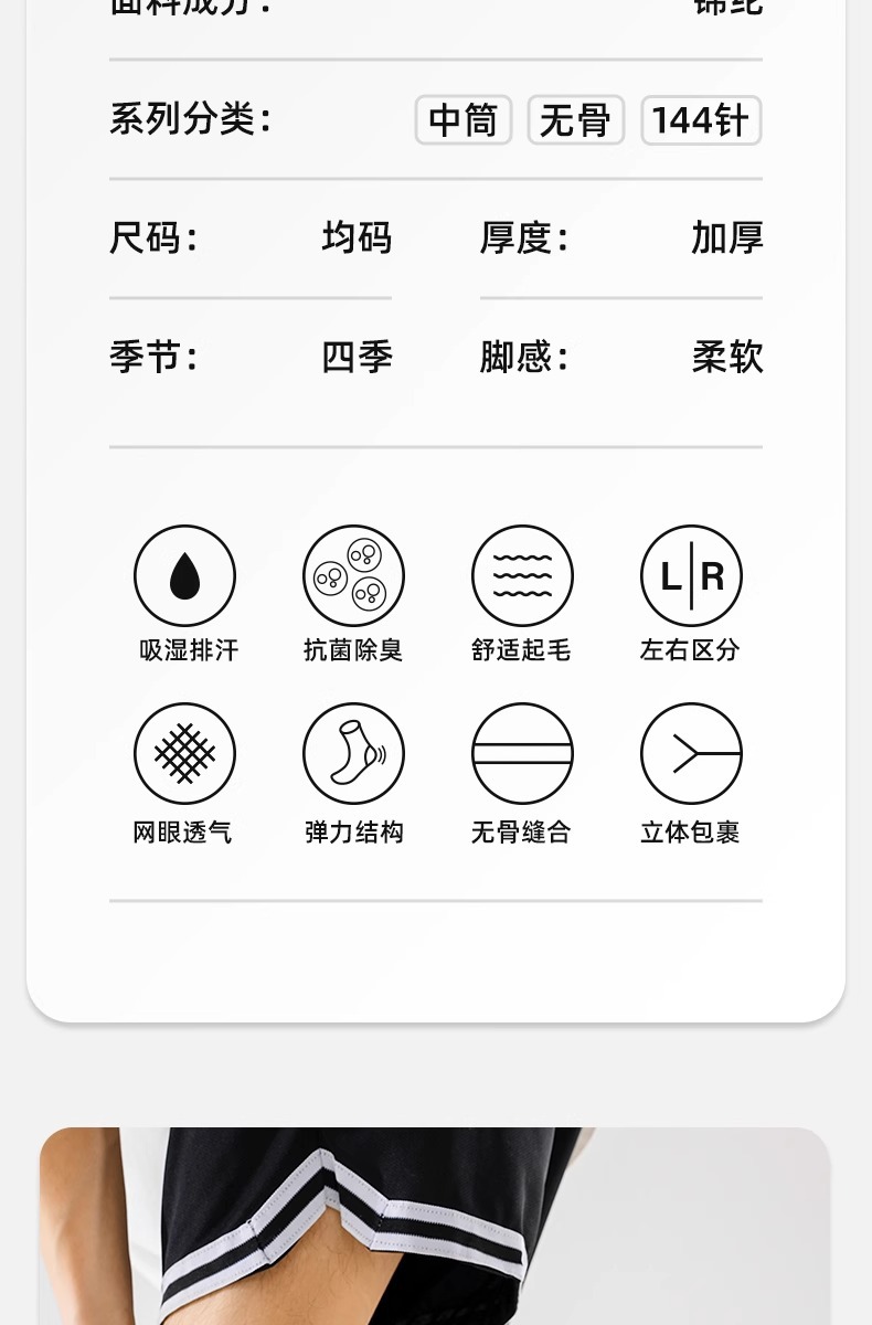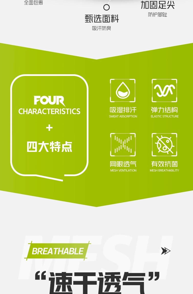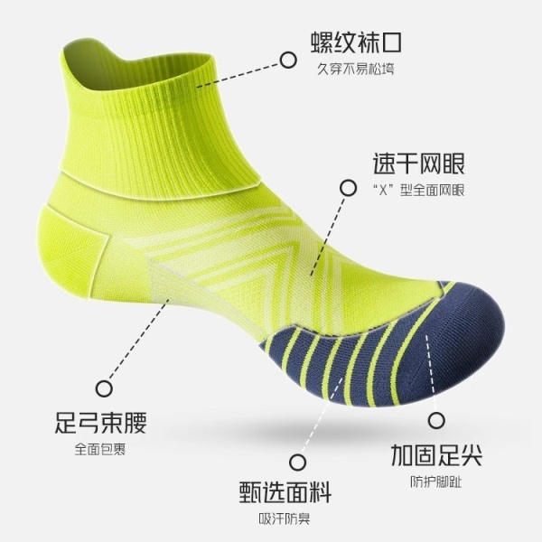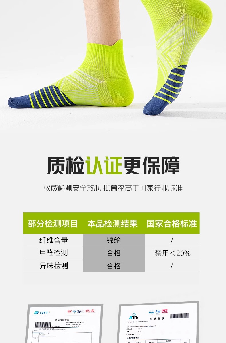 商品属性 [上市年份/季节] 2024春季 [上市时间] 2023年夏季 [主面料成分] 锦纶 [主面料成分含量] 80%(含)-90%(不含) [产品类别] 专业运动袜 [产地] 嘉兴 [功能] 吸汗,防摩擦 [包装形式] 袋装 [图案] 拼色 [成分及含量] 85 [无骨缝制] 是:手工无骨缝头 [是否跨境出口专供货源] 是 [是否进口] 否 [筒高] 短筒 [织造方法] 单针 [适合季节] 四季通用 [适用场景] 跑步 [适用年龄段] 青年(18-40周岁) [适用性别] 男 [针数] 200N [面料名称] 锦纶 [风格] 运动