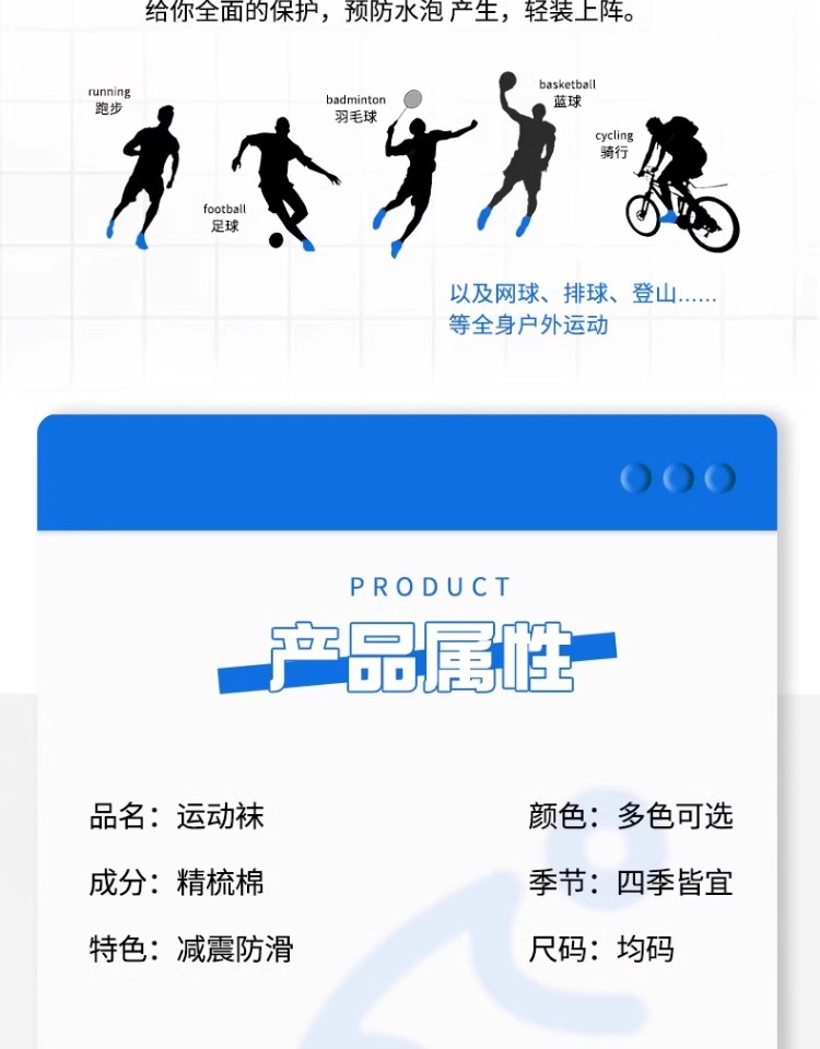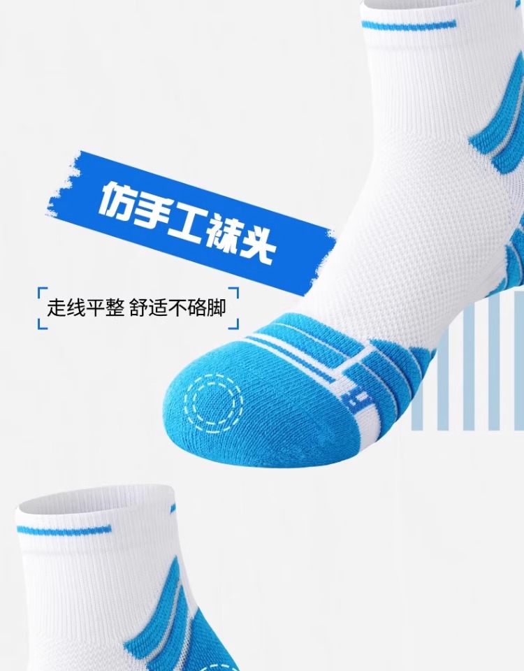 商品属性 [上市年份/季节] 2024春季 [上市时间] 2024年春季 [主面料成分] 棉 [主面料成分含量] 50%(含)-70%(不含) [产品类别] 专业运动袜 [产地] 诸暨 [功能] 防滑,吸汗,防臭 [包装形式] 袋装 [图案] 拼色 [成分及含量] 75 [无骨缝制] 是:手工无骨缝头 [是否跨境出口专供货源] 是 [是否进口] 否 [筒高] 中筒 [织造方法] 单针 [适合季节] 春季 [适用场景] 跑步 [适用年龄段] 青年(18-40周岁),中年(40-60周岁),少年(13-18周岁) [适用性别] 男 [针数] 144N [面料名称] 棉 [风格] 运动