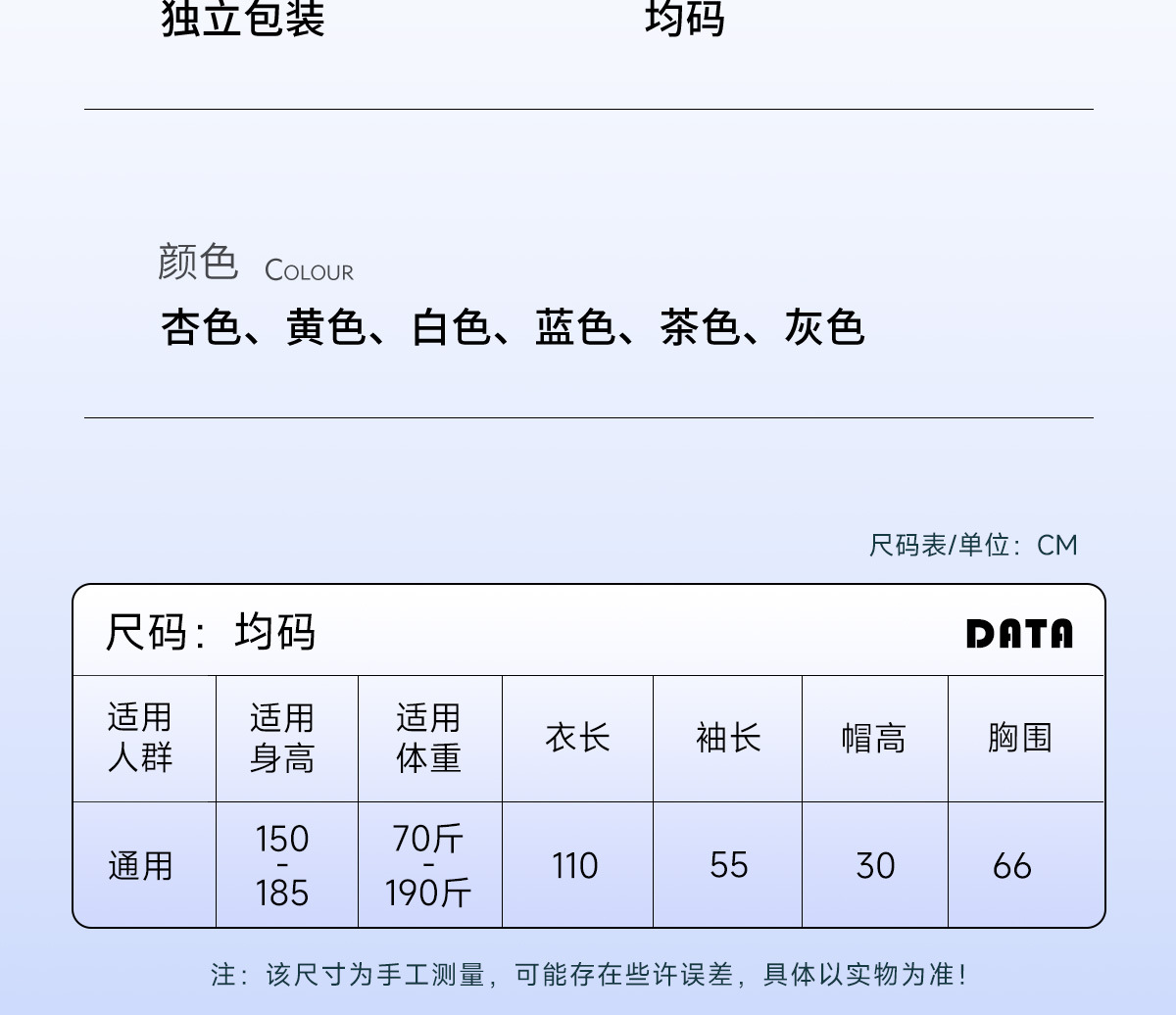 商品属性 [加印LOGO] 不可以 [加工定制] 是 [包装体积] 其它 [包装方式] 袋装 [商品条形码] 其它 [布料厚度] 加厚 [是否一次性] 否 [是否专利货源] 否 [是否跨境出口专供货源] 是 [是否进口] 否 [款式] 连体雨衣 [毛重] 140g [版权] 无 [适用人数] 1人 [适用对象] 成人 [防水胶层] 无 [雨具用途] 徒步雨披 [雨衣厚薄] 厚款 [雨衣布料] EVA [风格] 现代中式
