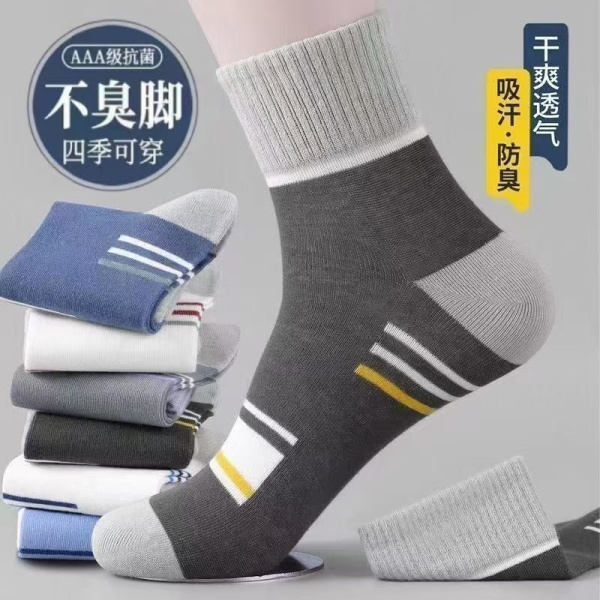 商品属性 [上市年份/季节] 2025年春季 [上市时间] 2025年春季 [主面料成分] 聚酯纤维(涤纶) [主面料成分含量] 90%(含)-95%(不含) [产品类别] 普通休闲袜 [产地] 诸暨 [功能] 速干,本命年,隐形,防滑,吸汗,防臭,防摩擦 [包装形式] 无包装 [图案] 纯色,拼色,条纹/格子 [成分及含量] 90 [无骨缝制] 否:机器缝头 [是否跨境出口专供货源] 是 [是否进口] 否 [筒高] 中筒 [织造方法] 单针 [适合季节] 冬季,春季,秋季,四季通用 [适用年龄段] 青年(18-40周岁),中年(40-60周岁),老年(60周岁以上) [适用性别] 男 [针数] 144N [面料名称] 涤棉 [风格] 运动