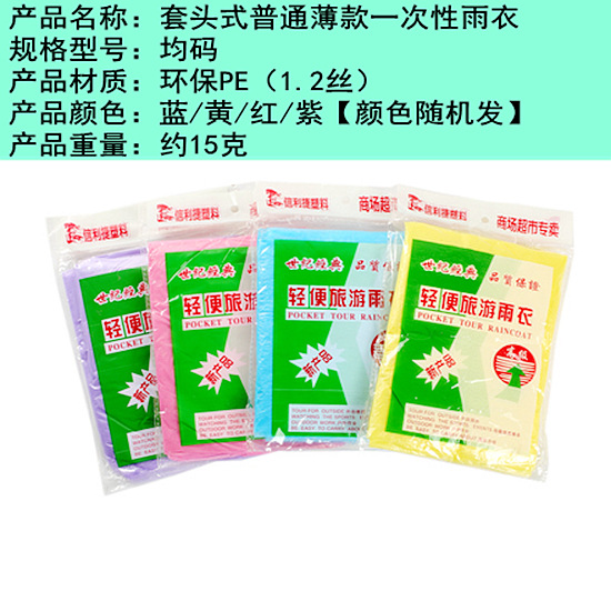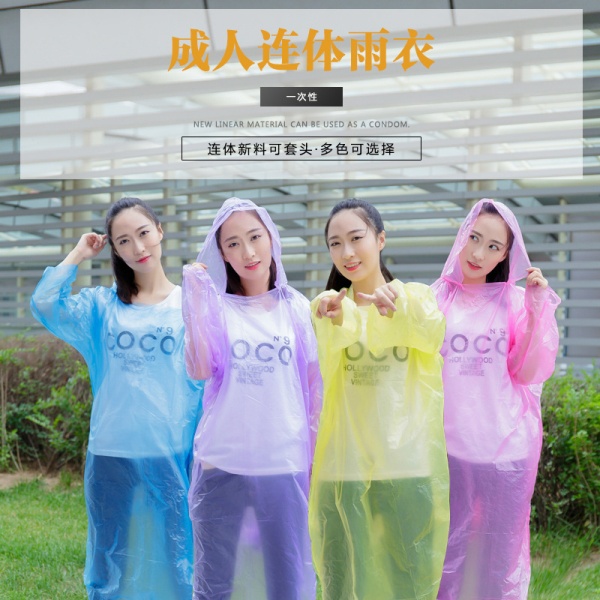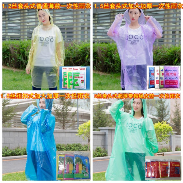 商品属性 [产地(国内)] 浙江省 [加印LOGO] 不可以 [加工定制] 否 [包装方式] 袋装 [是否一次性] 是 [是否专利货源] 否 [是否跨境出口专供货源] 否 [是否进口] 否 [款式] 连体雨衣 [适用人数] 1人 [适用对象] 成人 [防水胶层] 无 [雨具用途] 徒步雨披 [雨衣厚薄] 常规 [雨衣布料] PE膜 [风格] 现代简约