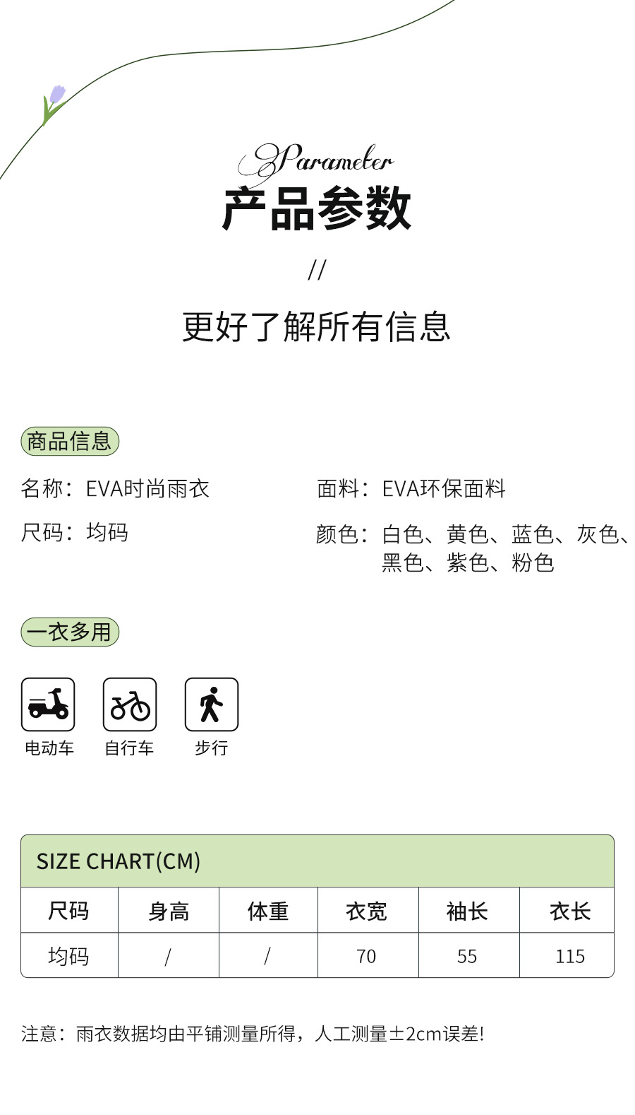 商品属性 [主要下游平台] 独立站,LAZADA,其他 [主要销售地区] 东北亚,其他 [产地(国内)] 江苏省 [加印LOGO] 不可以 [加工定制] 否 [包装方式] 袋装 [布料厚度] 16丝 [是否一次性] 是 [是否专利货源] 否 [是否跨境出口专供货源] 是 [是否进口] 否 [款式] 连体雨衣 [毛重] 100g [适用人数] 1人 [适用对象] 成人 [防水胶层] PVC胶 [雨具用途] 徒步雨披 [雨衣厚薄] 常规 [雨衣布料] EVA [风格] 轻奢