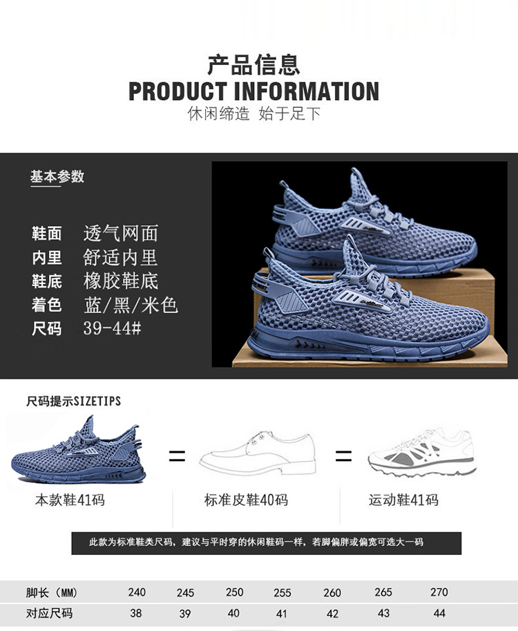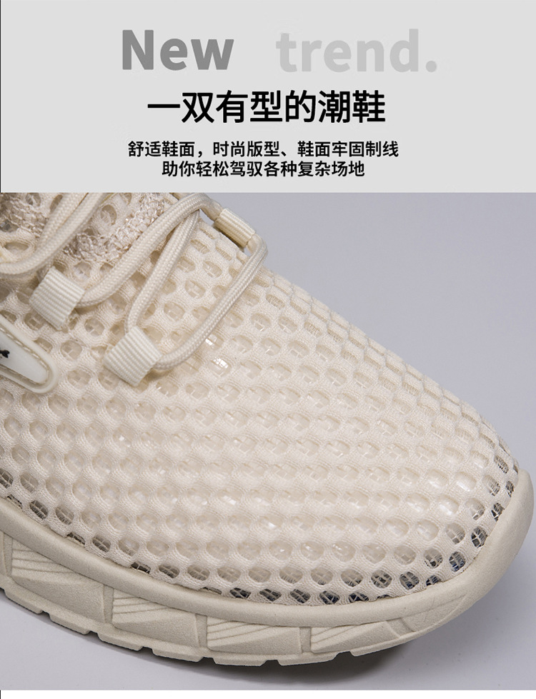 商品属性 [上市年份季节(上市时间)] 2025年春季 [主要下游平台] ebay,亚马逊,wish,速卖通,独立站,LAZADA [主要销售地区] 非洲,欧洲,南美,东南亚,北美,东北亚,中东 [内里材质] 网纱 [功能] 透气 [包装体积] 800g [厚薄] 薄 [图案] 纯色 [外贸类型] 出口 [库存类型] 整单 [形象] shoes [是否外贸] 是 [是否库存] 是 [是否跨境出口专供货源] 是 [最快出货时间] 1-3天 [最晚发货时间] 2天 [有可授权的自有品牌] 否 [款式] 沙滩鞋 [毛重] 700g [流行元素] 镂空 [穿着方式] 前系带 [筒高] 低筒 [系列] shoes [货源类别] 现货 [质检单位] 自检 [质检报告] 否 [适合季节] 夏季 [适用年龄段] 青年(18-40周岁) [闭合方式] 系带 [鞋垫材质] EVA [鞋头形状] 圆头 [鞋底工艺] 注塑鞋 [鞋底材质] PVC [鞋跟形状] 平跟 [鞋跟高度] 平跟 [鞋面材质] 网布面 [风格] 简约