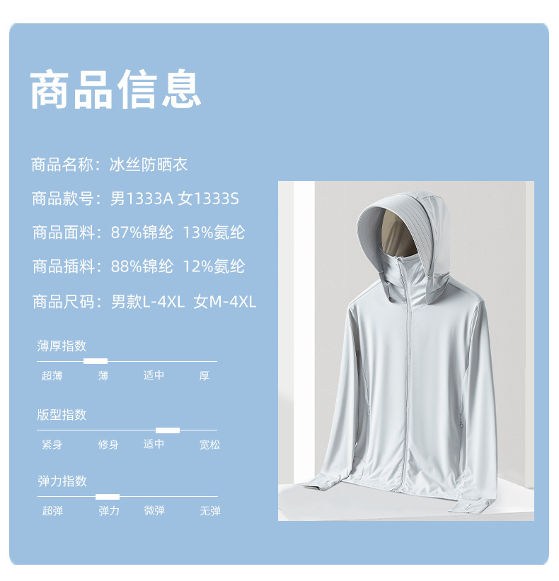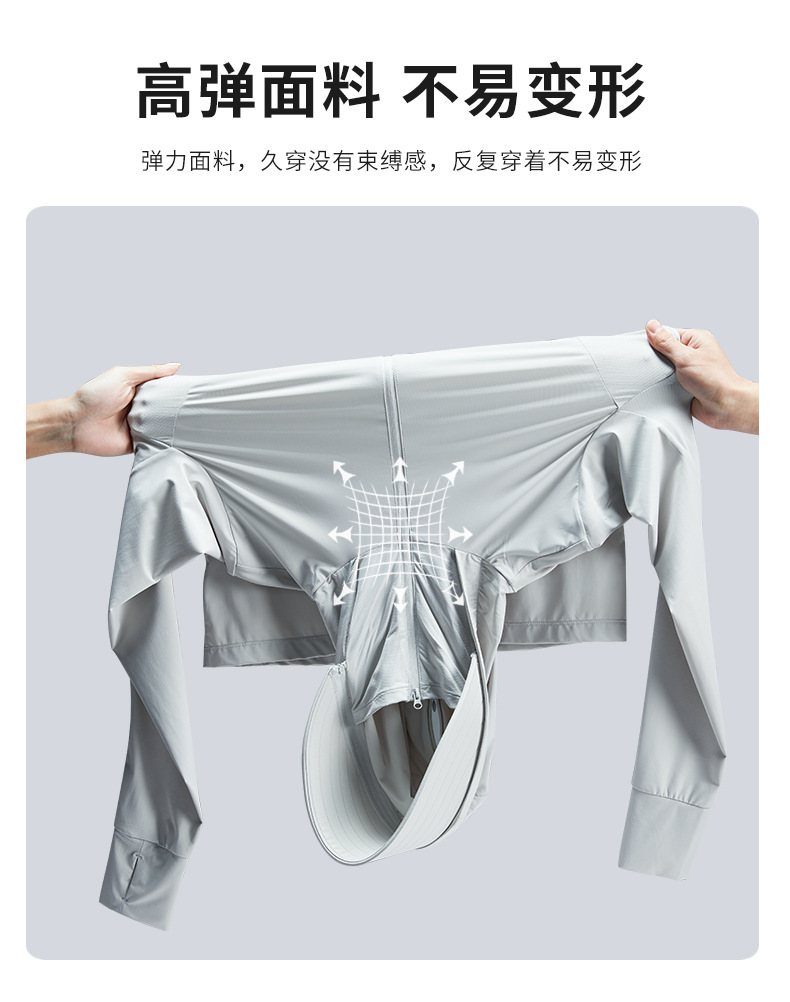 商品属性 [产地] 福建 [功能] 速干,透气,防紫外线,超轻,吸湿排汗 [图案] 纯色 [是否可脱卸] 可脱卸 [是否跨境出口专供货源] 是 [是否连帽] 连帽 [最快出货时间] 1-3天 [款号] F1333A [紫外线防护系数] UPF50+ [衣长] 常规 [质量等级] 一等品 [适合季节] 夏季 [适用场景] 跑步运动,运动潮流,骑行运动,徒步登山野营,垂钓运动 [适用年龄段] 成年 [适用性别] 中性/男女均可 [适用运动] 攀岩,徒步,露营,钓鱼,户外登山,旅行,郊游,骑行,自驾 [防晒系数] UPF50+ [面料] 锦纶 [主要下游平台] ebay,亚马逊,wish,速卖通,独立站,LAZADA [主要销售地区] 非洲,欧洲,南美,东南亚,北美,东北亚,中东 [吊牌价] 199 [有可授权的自有品牌] 是