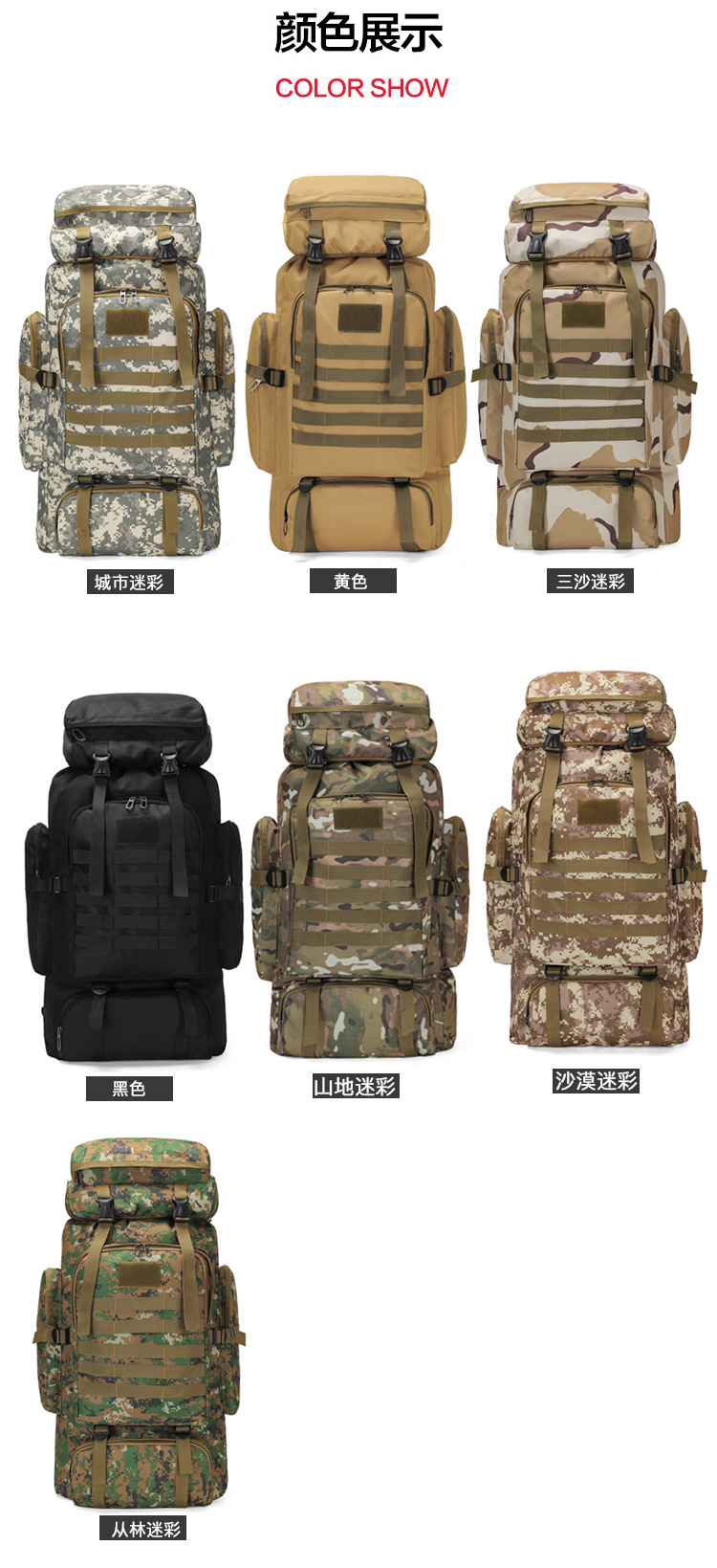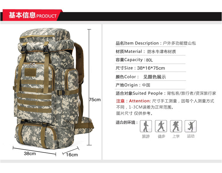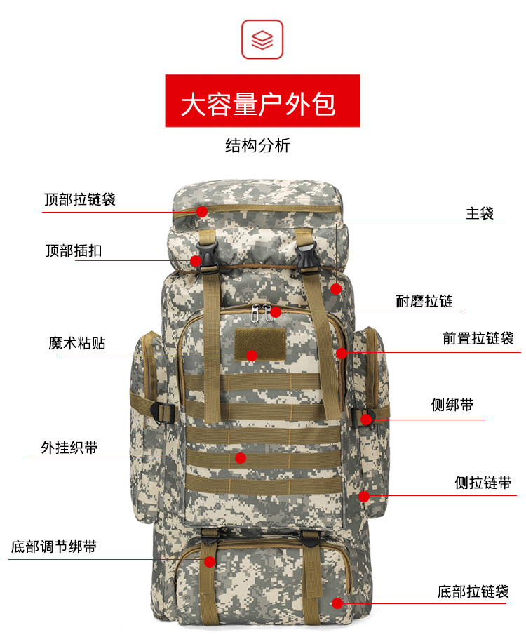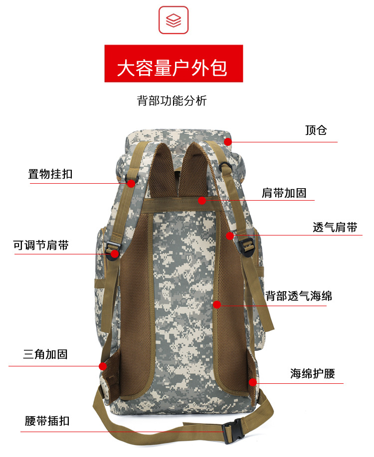 商品属性 [上市年份季节] 2025夏季 [功能] 耐磨,扩容,减负,护脊 [图案] 迷彩 [有可授权的自有品牌] 是 [材质] 牛津布 [适用场景] 户外运动 [适用性别] 中性/男女均可 [里料质地] 涤纶 [风格] 城市趣野