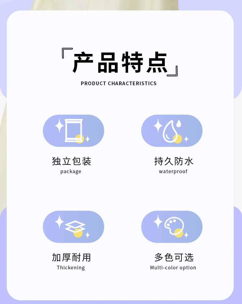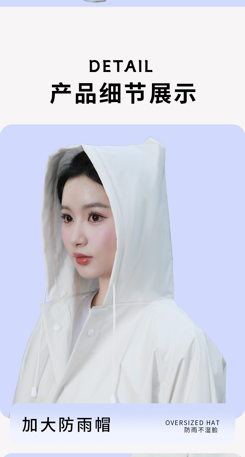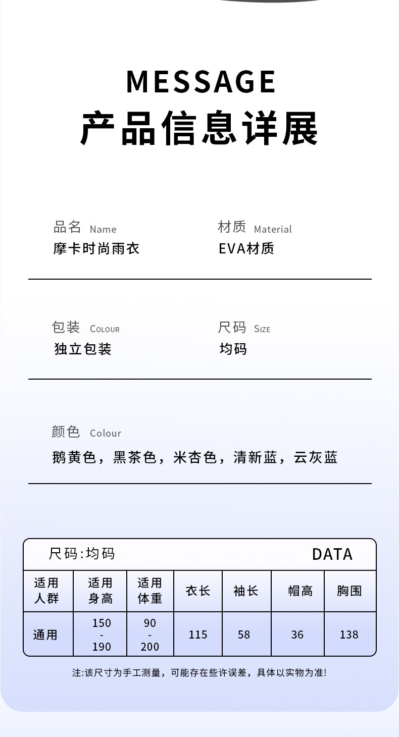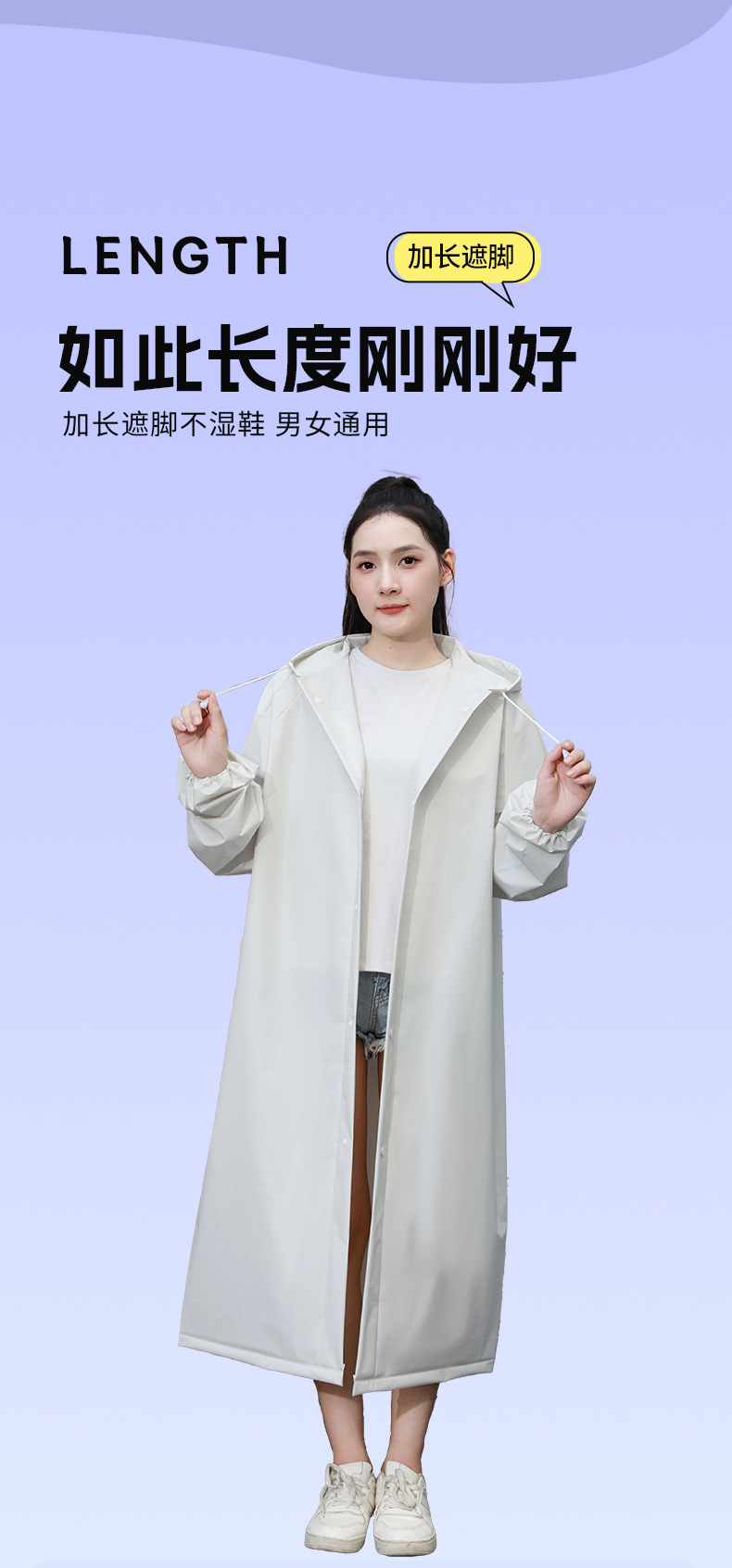 商品属性 [主要下游平台] ebay,亚马逊,wish,速卖通,独立站,LAZADA [主要销售地区] 北美,东北亚,中东,其他 [产地(国内)] 浙江省 [加印LOGO] 不可以 [加工定制] 否 [包装体积] 27*21*5cm [包装方式] 袋装 [商品条形码] 咨询业务 [布料厚度] 17丝 [是否一次性] 否 [是否专利货源] 否 [是否跨境出口专供货源] 是 [是否进口] 否 [有可授权的自有品牌] 是 [款式] 连体雨衣 [毛重] 100g左右 [版权] 无 [适用人数] 1人 [适用对象] 成人 [防水胶层] PE胶 [雨具用途] 徒步雨披 [雨衣厚薄] 厚款 [雨衣布料] EVA [风格] 现代简约
