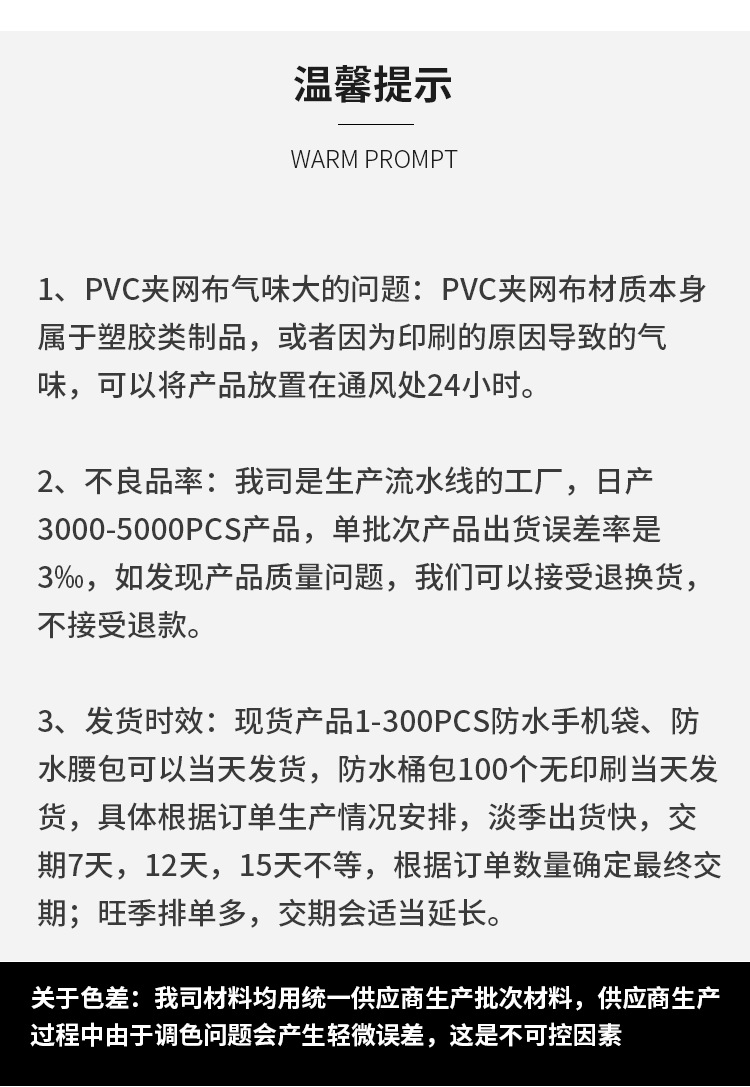 商品属性 [加印LOGO] 是 [加工定制] 是 [图案] 纯色 [库存类型] 杂款 [应用场景] 休闲,登山,沙滩,垂钓,户外,野营,摄影 [是否外贸] 否 [是否库存] 否 [是否跨境出口专供货源] 否 [最快出货时间] 20天 [材质] 500DPVC夹网布 [货源类别] 订货 [运动户外包] 防水包 [适用场景] 运动潮流,冰雪运动,极限挑战,徒步登山野营,运动护具配件,场地游艺设备,运动户外包类,垂钓运动,游泳涉水运动 [适用年龄段] 成年 [适用性别] 中性/男女均可 [面料] 防水面料 [风格] 户外运动