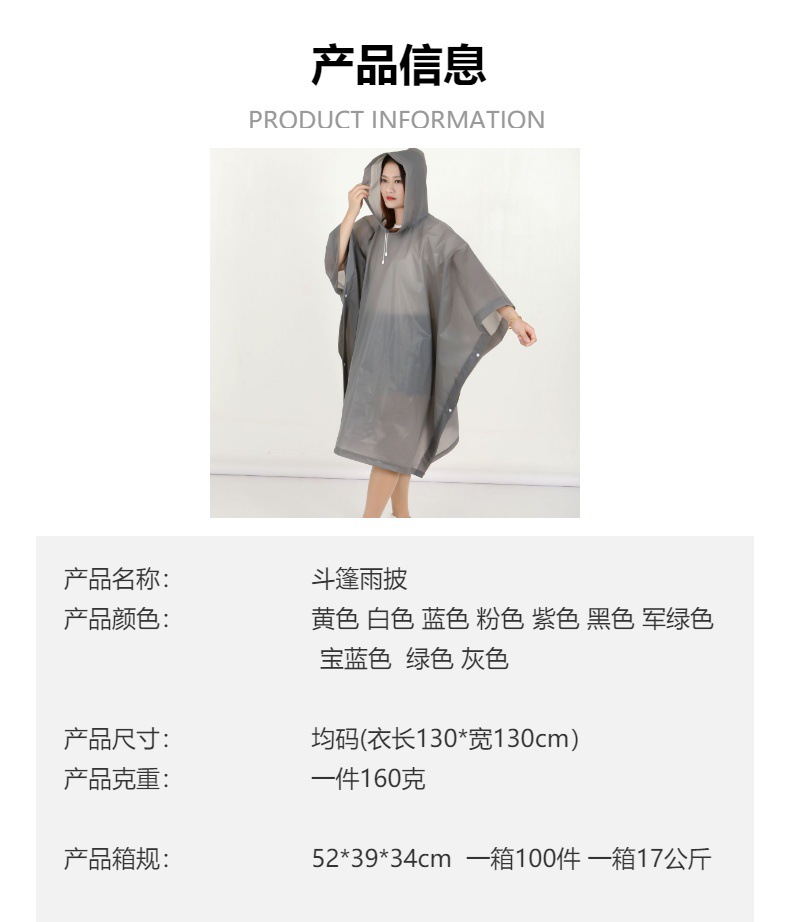 商品属性 [产地(国内)] 浙江省 [加印LOGO] 可以 [加工定制] 是 [包装体积] 24*20CM [包装方式] 袋装 [布料厚度] 0.13 [是否一次性] 否 [是否专利货源] 否 [是否跨境出口专供货源] 否 [是否进口] 否 [款式] 徒步雨衣 [毛重] 160克 [适用人数] 1人 [适用对象] 成人 [防水胶层] 无 [雨具用途] 徒步雨披 [雨衣厚薄] 常规 [雨衣布料] PEVA [风格] 百搭