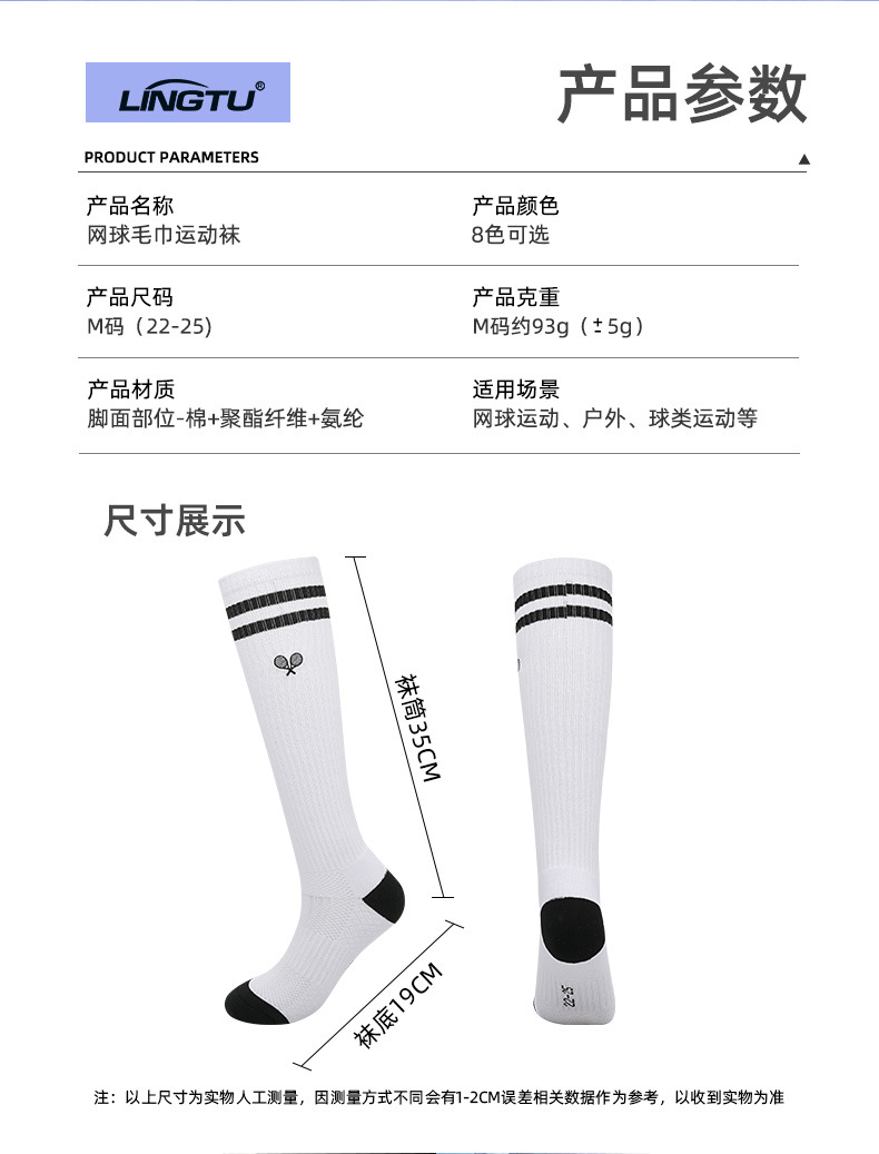 商品属性 [上市年份/季节] 2025年夏季 [上市时间] 2025夏季 [主面料成分] 棉 [主面料成分含量] 50%(含)-70%(不含) [产品类别] 专业运动袜 [产地] 中国佛山 [功能] 速干,防滑,吸汗,防臭,防摩擦 [包装形式] 袋装 [图案] 条纹/格子 [成分及含量] 棉 [无骨缝制] 否:机器缝头 [是否跨境出口专供货源] 是 [是否进口] 否 [筒高] 高筒 [织造方法] 单针 [适合季节] 夏季,冬季,春季,秋季 [适用场景] 网球 [适用年龄段] 青年(18-40周岁),少年(13-18周岁) [适用性别] 中性/男女均可 [针数] 144N [面料名称] 棉 [风格] 运动
