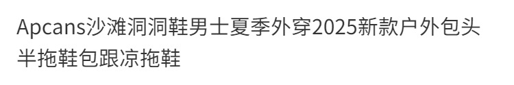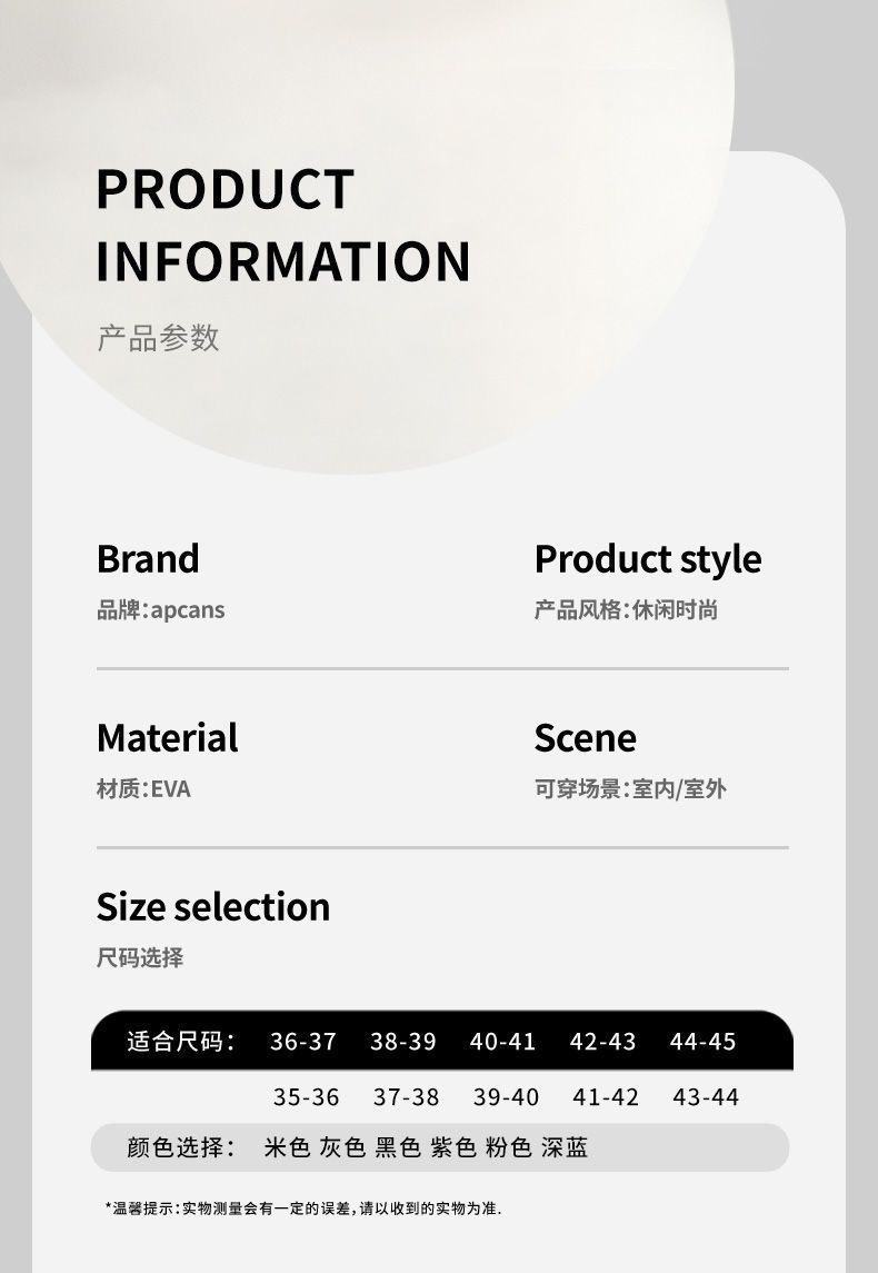 商品属性 [上市年份季节(上市时间)] 2025年春季 [主要下游平台] ebay,亚马逊,wish,速卖通,LAZADA [主要销售地区] 非洲,欧洲,南美,东南亚,北美,东北亚,中东,其他 [内里材质] EVA [厚薄] 加厚 [是否库存] 是 [最快出货时间] 1-3天 [最晚发货时间] 3天 [有可授权的自有品牌] 是 [款式] 包头 [货源类别] 现货 [适用年龄段] 青年(18-40周岁) [鞋垫材质] EVA [鞋头形状] 圆形 [鞋底工艺] 注塑 [鞋底材质] EVA [鞋跟形状] 圆形 [鞋面材质] EVA [风格] 日常休闲