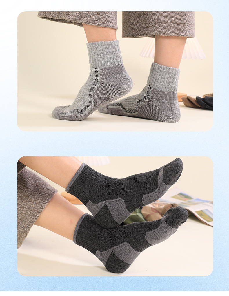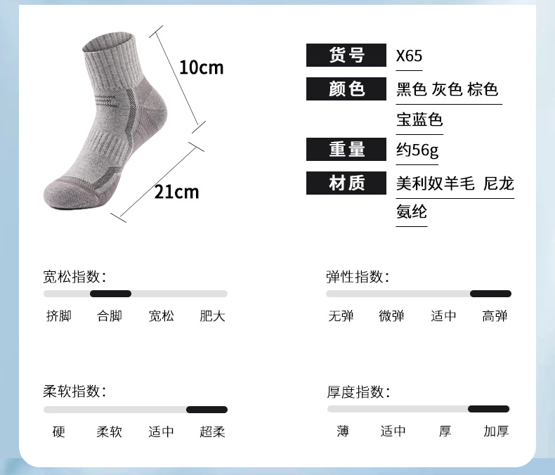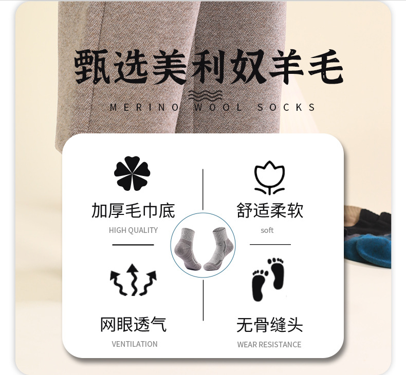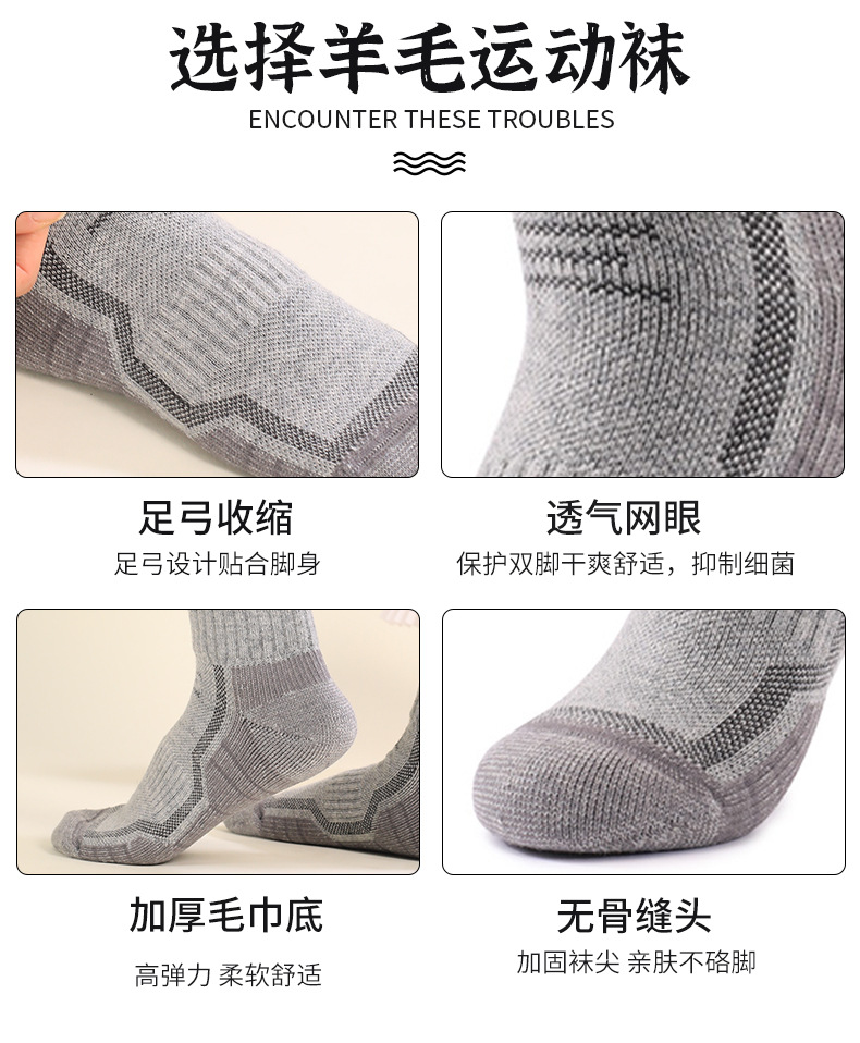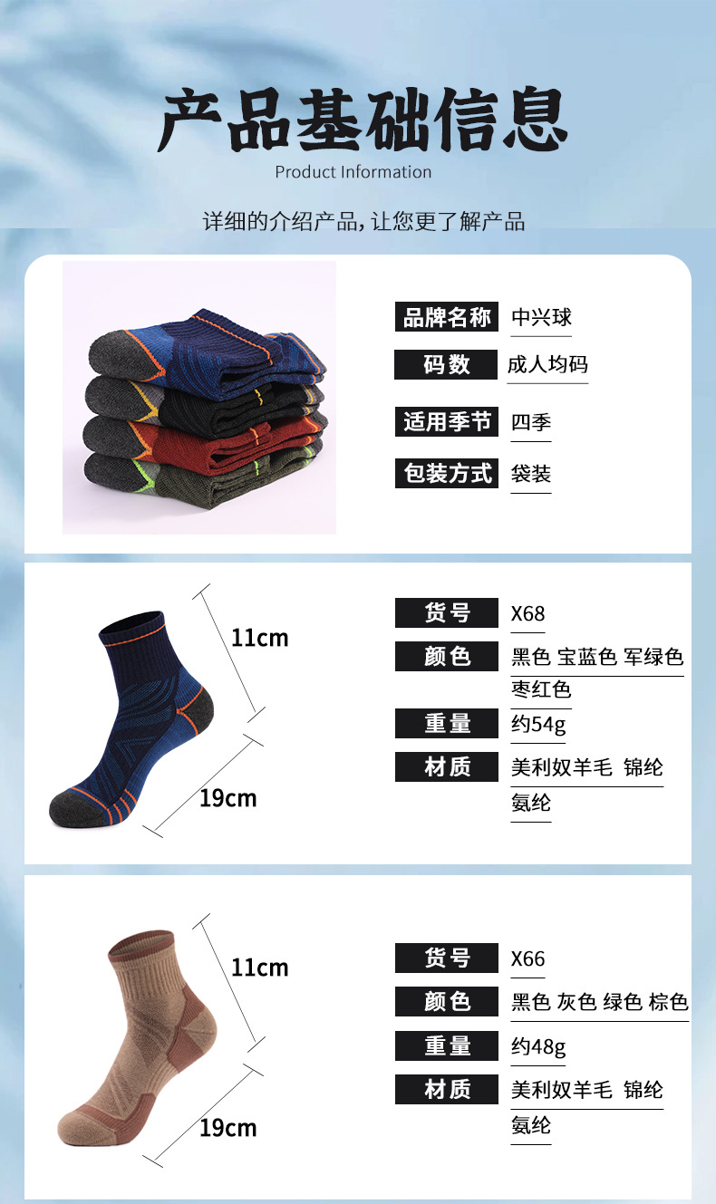 商品属性 [上市年份/季节] 2024年夏季 [上市时间] 2024年夏季 [主面料成分] 羊毛 [主面料成分含量] 30%以下 [产品类别] 专业运动袜 [产地] 佛山 [功能] 吸汗,防臭 [包装形式] 袋装 [图案] 拼色 [成分及含量] 30 [无骨缝制] 是:手工无骨缝头 [是否跨境出口专供货源] 是 [是否进口] 否 [筒高] 中筒 [织造方法] 单针 [适合季节] 冬季 [适用场景] 山地运动 [适用年龄段] 青年(18-40周岁) [适用性别] 中性/男女均可 [针数] 144N [面料名称] 羊毛 [风格] 简约