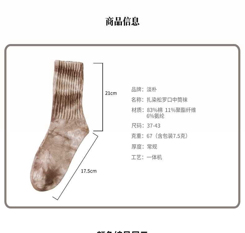 商品属性 [上市年份/季节] 2025年春季 [上市时间] 2025年春季 [主面料成分] 棉 [主面料成分含量] 80%(含)-90%(不含) [产品类别] 普通休闲袜 [产地] 诸暨 [功能] 吸汗,防臭 [包装形式] 袋装 [图案] 渐变 [成分及含量] 棉83 [无骨缝制] 是:手工无骨缝头 [是否跨境出口专供货源] 是 [是否进口] 否 [筒高] 高筒 [织造方法] 单针 [适合季节] 夏季,冬季,春季,秋季 [适用年龄段] 青年(18-40周岁) [适用性别] 中性/男女均可 [针数] 168N [面料名称] 棉 [风格] 休闲