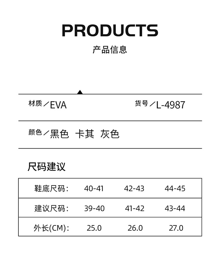 商品属性 [上市年份季节(上市时间)] 2024年秋季 [主要下游平台] ebay,亚马逊,wish,速卖通,独立站,LAZADA,其他 [主要销售地区] 非洲,欧洲,南美,东南亚,北美,中东 [内里材质] eva [功能] 其他 [加工方式] 注塑 [厚薄] 加厚 [图案] 纯色 [库存类型] 整单 [形象] - [是否外贸] 否 [是否库存] 是 [是否跨境出口专供货源] 否 [最快出货时间] 1-3天 [最晚发货时间] 3天 [有可授权的自有品牌] 否 [款式] 包头 [毛重] 400 [流行元素] 素面 [皮质特征] 修面皮 [穿着方式] 不限 [筒高] - [系列] - [货源类别] 现货 [质检单位] - [质检报告] 否 [适合季节] - [适用年龄段] 成年 [闭合方式] 套筒 [鞋垫材质] eva [鞋头形状] 包头 [鞋底工艺] 注塑 [鞋底材质] EVA [鞋跟形状] 加厚 [鞋跟高度] 3.5 [鞋面材质] EVA [风格] 青春潮流
