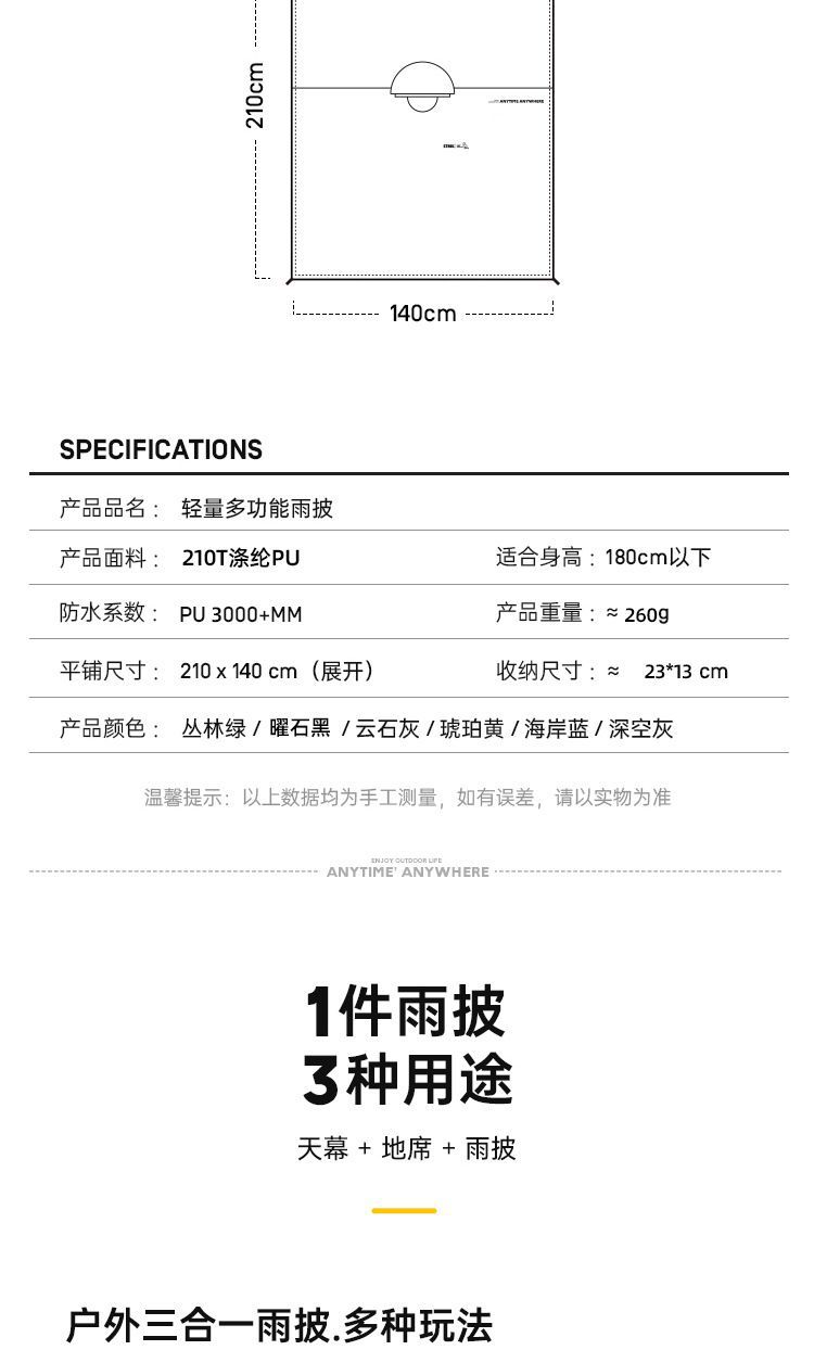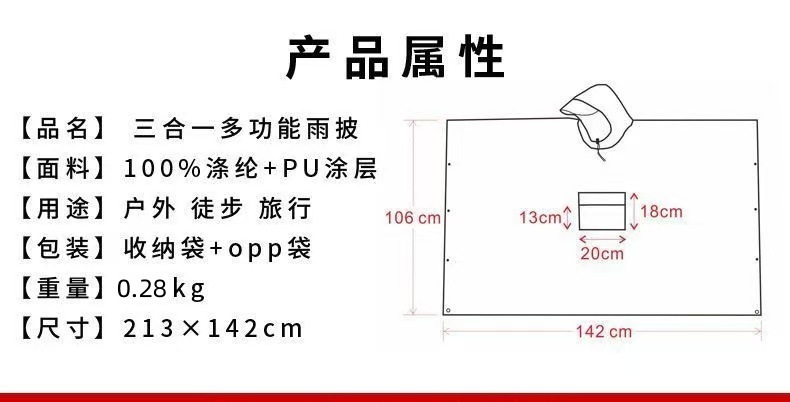 商品属性 [主要下游平台] 亚马逊,wish,速卖通 [主要销售地区] 欧洲,南美,北美 [产地(国内)] 河南省 [加印LOGO] 可以 [加工定制] 是 [包装体积] 1 [包装方式] 袋装 [商品条形码] 咨询客服 [布料厚度] 10丝 [是否一次性] 否 [是否专利货源] 否 [是否跨境出口专供货源] 是 [是否进口] 否 [有可授权的自有品牌] 否 [款式] 斗篷雨衣 [毛重] 0.2kg [版权] 无 [适用人数] 1人 [适用对象] 成人 [防水胶层] 其他 [雨具用途] 自行车雨披 [雨衣厚薄] 薄款 [雨衣布料] 涤塔夫 [风格] 百搭