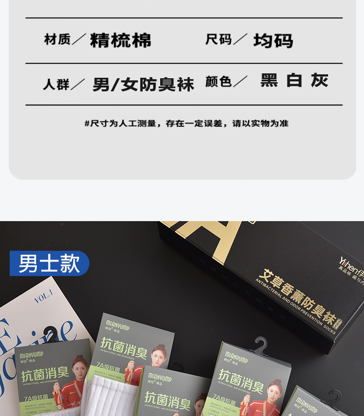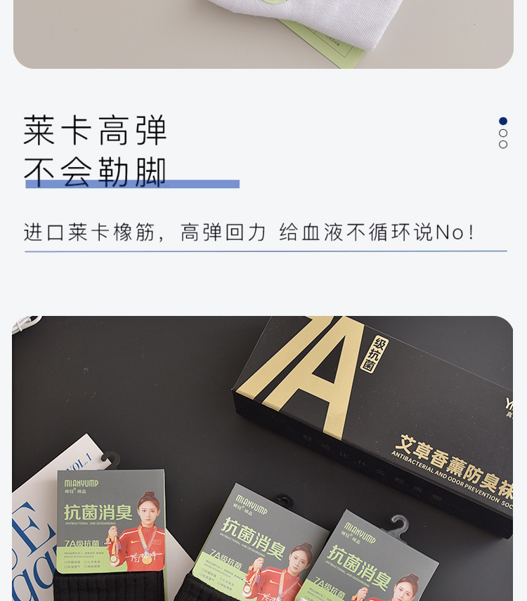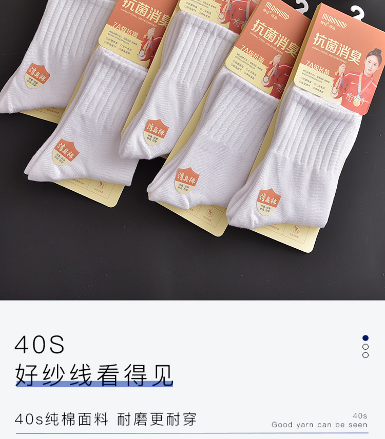 商品属性 [上市年份/季节] 2024秋季 [上市时间] 2024年秋季 [主面料成分] 棉 [主面料成分含量] 50%(含)-70%(不含) [产品类别] 普通休闲袜 [产地] 辽源 [功能] 速干,抗菌,吸汗,防臭 [包装形式] 袋装 [图案] 纯色 [成分及含量] 100 [无骨缝制] 否:机器缝头 [是否跨境出口专供货源] 否 [是否进口] 否 [筒高] 中筒 [织造方法] 单针 [适合季节] 冬季,春季,秋季,四季通用 [适用年龄段] 青年(18-40周岁),少年(13-18周岁) [适用性别] 中性/男女均可 [针数] 200N [面料名称] 精梳棉 [风格] 运动