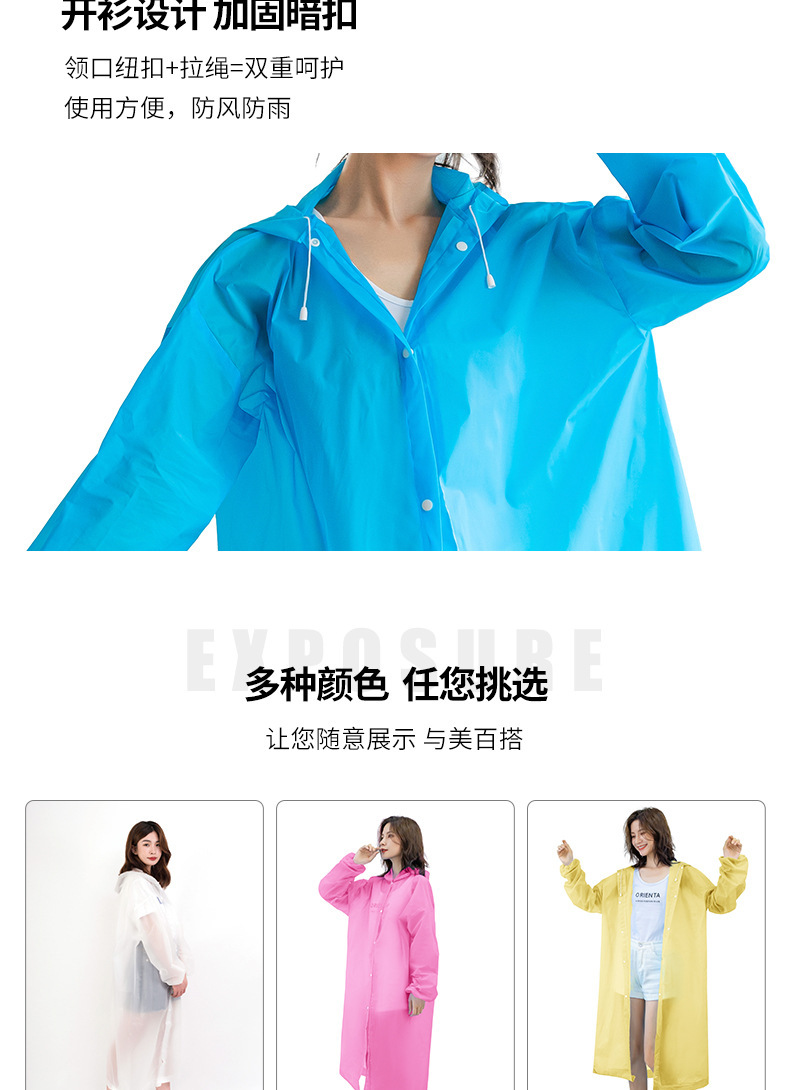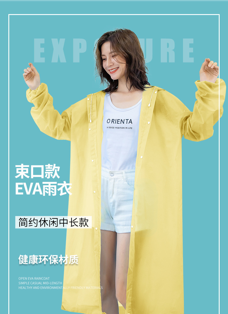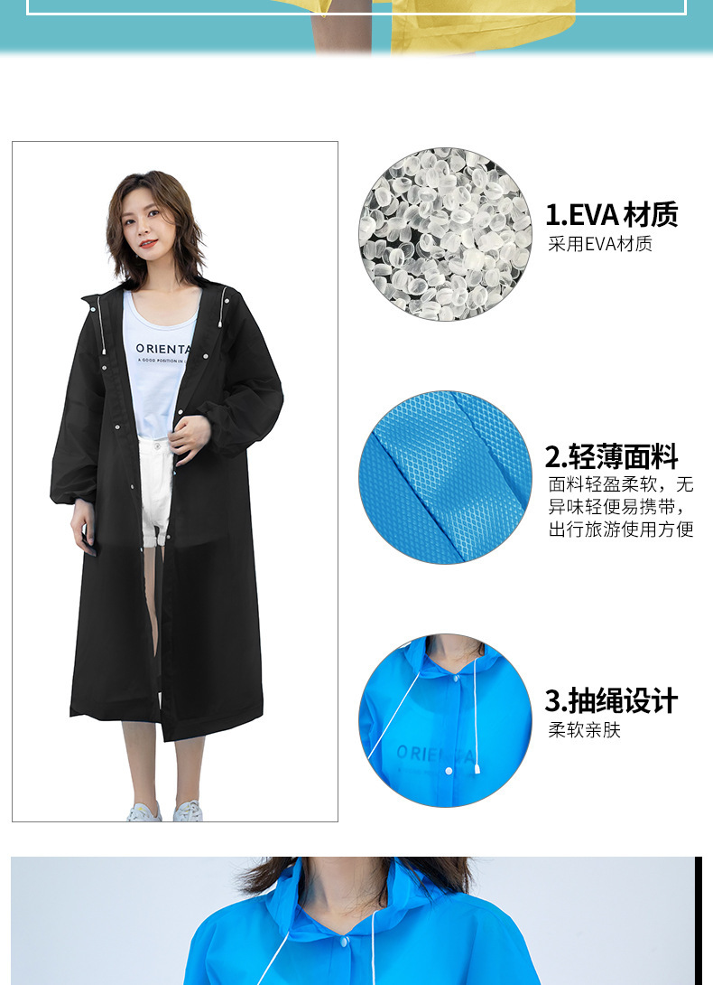 商品属性 [主要下游平台] ebay,亚马逊,wish,速卖通,独立站,LAZADA [主要销售地区] 非洲,欧洲,南美,东南亚,北美,东北亚,中东 [产地(国内)] 浙江省 [加印LOGO] 可以 [加工定制] 是 [包装方式] 袋装 [型号] 非一次性雨衣 [布料厚度] 15 [是否一次性] 否 [是否专利货源] 否 [是否跨境出口专供货源] 是 [是否进口] 否 [有可授权的自有品牌] 是 [款式] 连体雨衣 [毛重] 150g [版权] 无 [适用人数] 1人 [适用对象] 成人 [防水胶层] PVC胶 [雨具用途] 徒步雨披 [雨衣厚薄] 厚款 [雨衣布料] EVA [风格] 现代简约