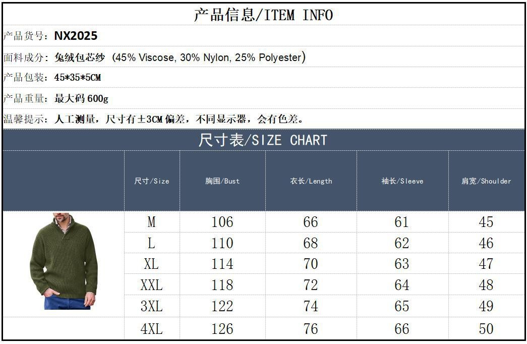 商品属性 [上市年份/季节] 2023年秋季 [主要下游平台] ebay,亚马逊,wish,速卖通,独立站,LAZADA [主要销售地区] 非洲,欧洲,南美,东南亚,北美,东北亚,中东 [主面料成分] 粘纤 [主面料成分的含量] 粘胶纤维(粘纤)50%、聚酯纤维30%、聚酰胺纤维(锦纶)20% [厚薄] 普通 [原创设计货源] 否 [工艺] 无 [库存类型] 整单 [是否库存] 是 [是否跨境出口专供货源] 是 [有可授权的自有品牌] 否 [有无质检报告] 否 [材质功能] 高弹,色牢度高 [款式] 套头 [款式细节] 罗纹底摆 [淘货类别] 商务绅士(35岁以上) [版型] 宽松型 [袖长] 长袖 [货源类别] 现货 [适合人群] 中年 [适合季节] 春秋季 [适用人群] 中年 [适用场景] 休闲 [面料名称] 粘胶纤维(粘纤)50%、聚酯纤维30%、聚酰胺纤维(锦纶)20% [领型] V字领 [风格] 韩版