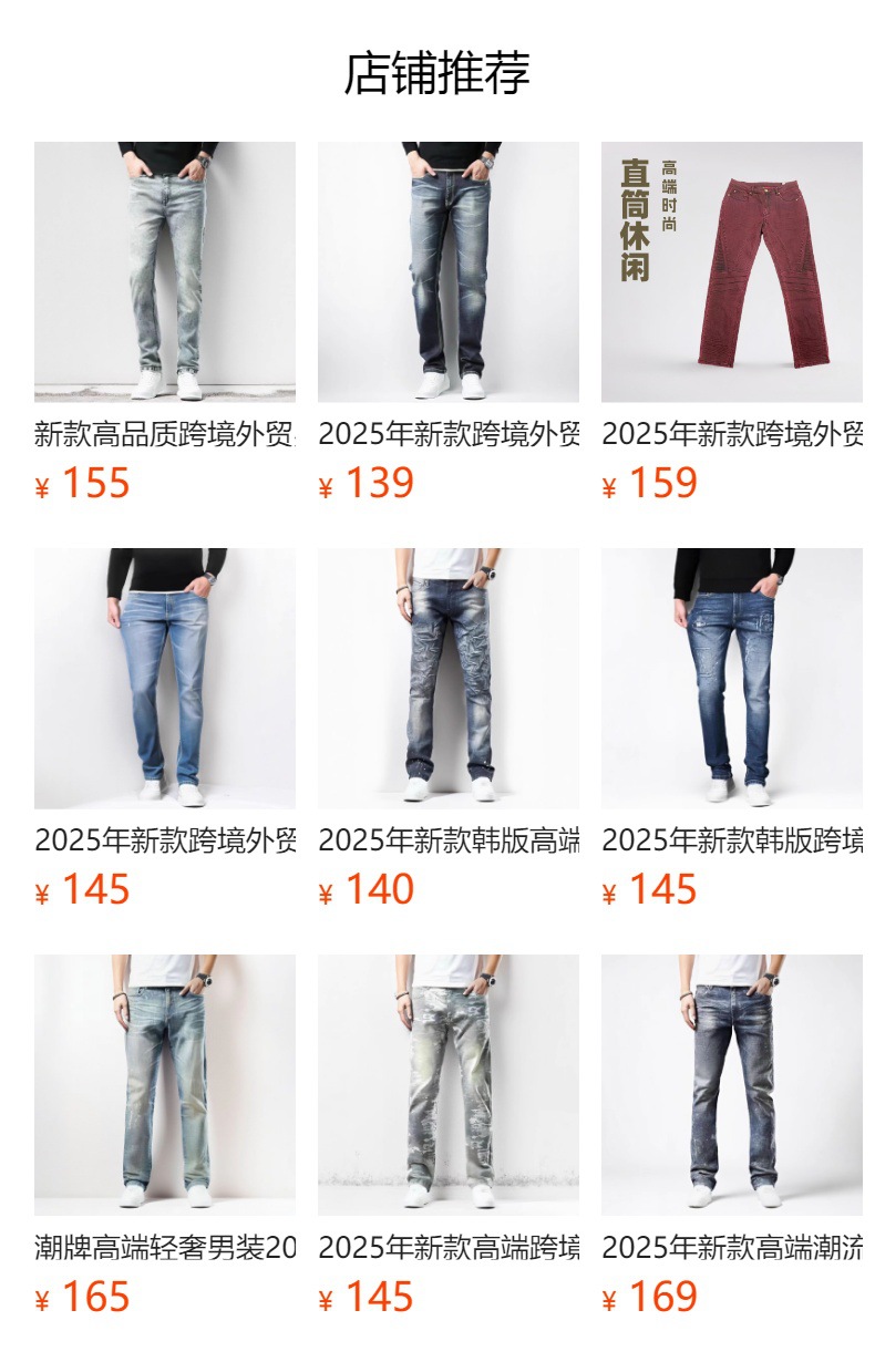 商品属性 [上市年份/季节] 2025年夏季 [主要下游平台] ebay,亚马逊,wish,速卖通,独立站,LAZADA,其他 [主要销售地区] 欧洲,东南亚,中东 [主面料成分] 棉 [主面料成分的含量] 65 [产地] 顺德均安 [厚薄] 普通 [原创设计货源] 是 [工艺] 泼墨 [弹力] 中弹 [是否跨境出口专供货源] 是 [最快出货时间] 16-30天 [有可授权的自有品牌] 是 [有无质检报告] 否 [款式] 基本款 [洗水工艺] 石洗/石磨 [淘货类别] 时尚都市(24-35岁) [特殊工艺] 水洗,磨破,褶皱,磨白,猫须,其他 [腰型] 中腰 [裤型] 宽松型 [裤脚口款式] 小直筒 [裤长] 长裤 [裤门襟] 拉链开襟 [误差范围] 1-3cm [货源类别] 订货 [适合人群] 青年 [适合季节] 四季 [适用场景] 休闲 [面料名称] 牛仔 [风格] 韩版