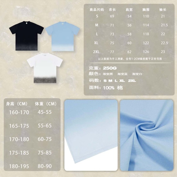 商品属性 [上市年份/季节] 2024年春季 [主要下游平台] ebay,亚马逊,wish,速卖通,独立站,LAZADA,其他 [主要销售地区] 非洲,欧洲,南美,东南亚,北美,东北亚,中东,其他 [主面料成分] 棉 [主面料成分的含量] 100% [克重] 250g [厚薄] 普通 [原创设计货源] 是 [图案] 纯色 [工艺] 渐变喷色 [库存类型] 整单 [是否库存] 是 [是否跨境出口专供货源] 是 [是否连帽] 不连帽 [有无质检报告] 否 [材质功能] 透气 [款式] 套头 [款式细节] 渐变 [淘货类别] 青春流行(18-24岁) [版型] 宽松型 [类别] T恤背心 [袖型] 插肩袖 [袖长] 短袖 [误差范围] 1-2cm [货源类别] 现货 [质检报告编号] 无 [适合人群] 青少年 [适合季节] 夏季,春季 [适用场景] 日常 [面料名称] 纯棉 [领型] 圆领 [风格] 高街