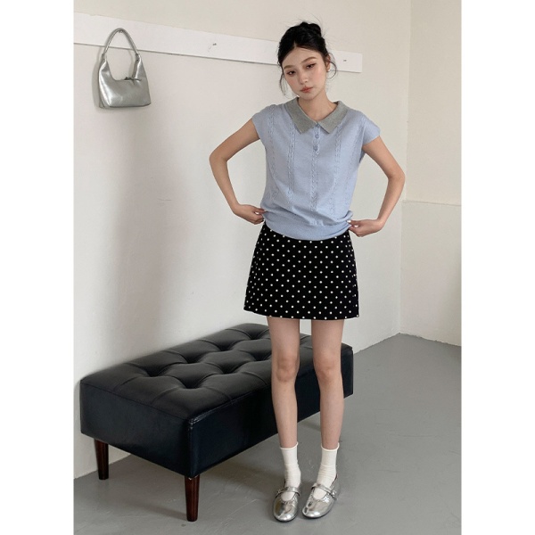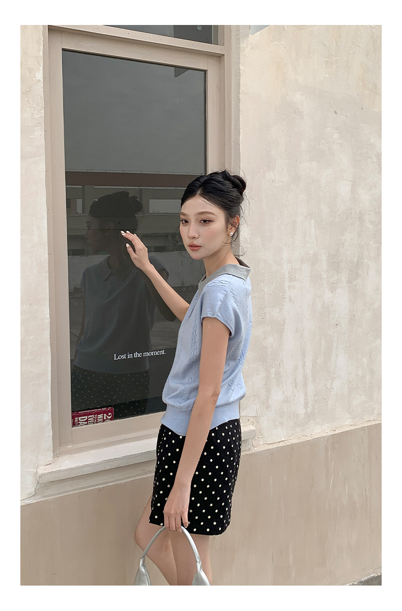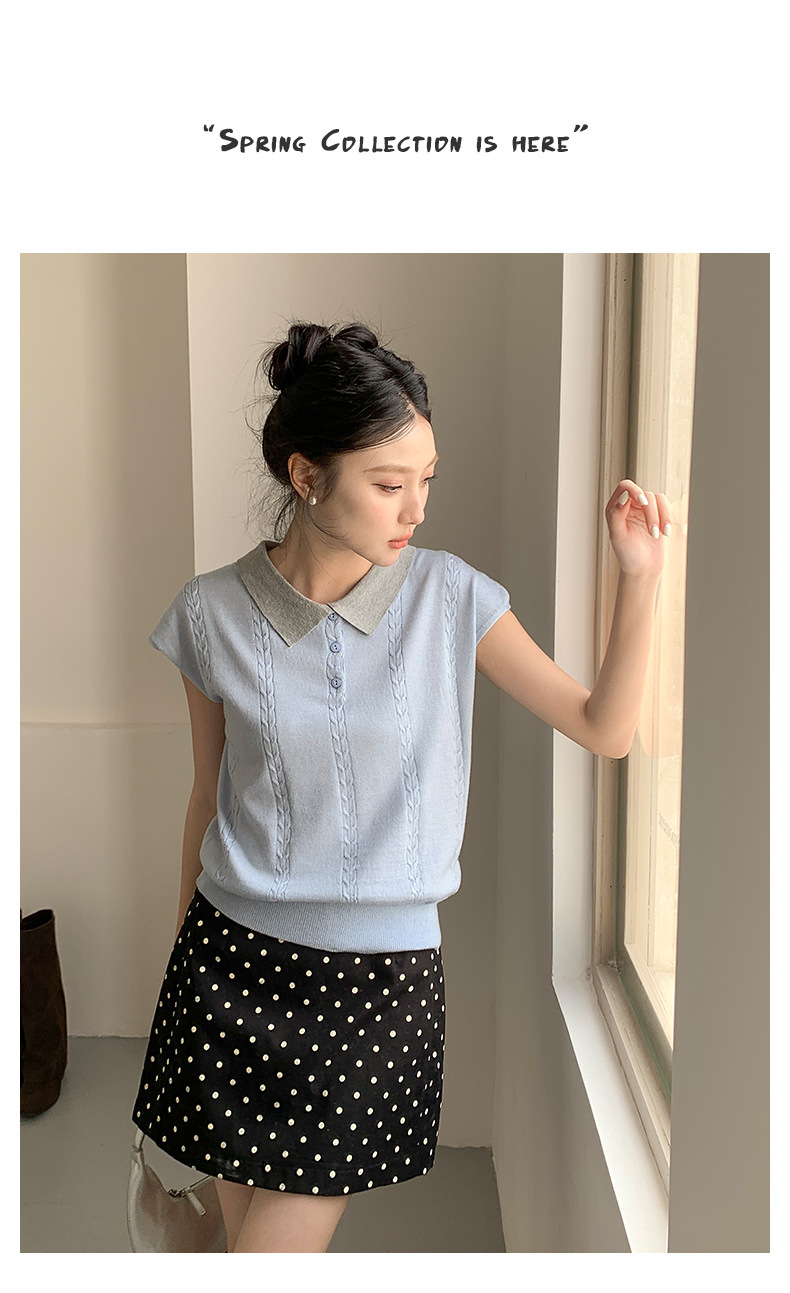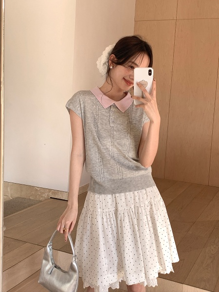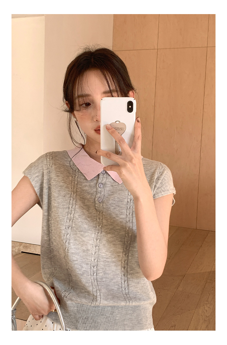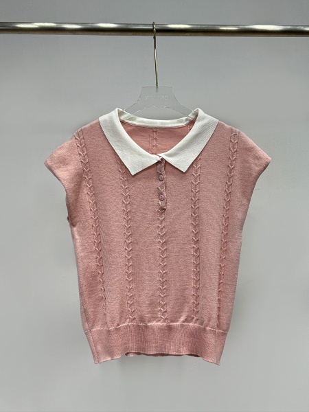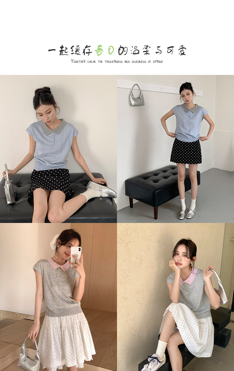 商品属性 [上市年份/季节] 2025年春季 [主面料成分] 腈纶 [主面料成分含量] 30%(含)-50%(不含) [厚薄] 薄 [图案] 纯色 [工艺] 免烫处理 [是否跨境货源] 否 [款式] 无袖款 [流行元素] 纯色 [版型] 常规 [穿着方式] 套头 [组合形式] 单件 [衣长] 普通款(50cm<衣长≤65cm) [袖型] 飞飞袖 [袖长] 无袖 [门襟] 套头 [面料名称] 39%涤纶;35%抗起球腈纶;20%锦纶;6%丝光羊毛 [领型] POLO领 [风格] 少女风 [风格类型] 清新甜美