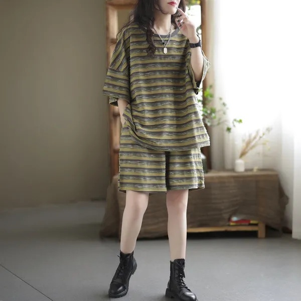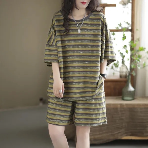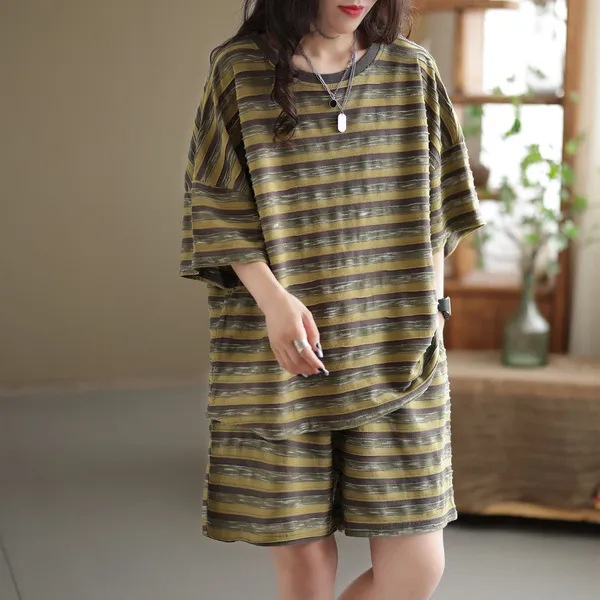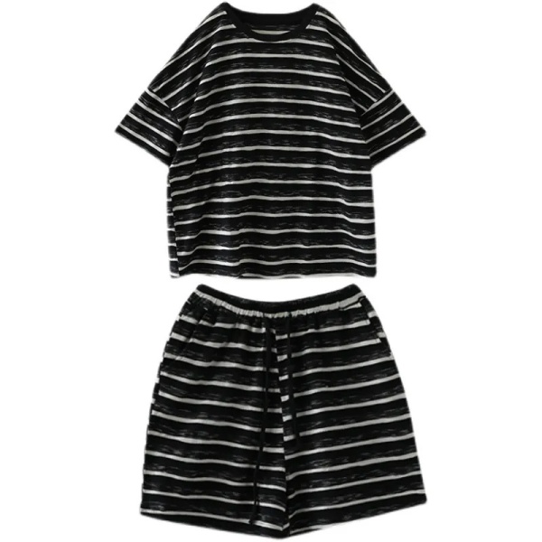 商品属性 [上市年份/季节] 2024年夏季 [主面料成分] 棉 [主面料成分2] 涤纶(聚酯纤维) [主面料成分2含量] 50%(含)-70%(不含) [主面料成分含量] 30%以下 [图案] 条纹/格子 [套装款式] 裤套装 [工艺] 印花 [是否跨境货源] 否 [流行元素] 口袋 [袖型] 常规袖 [袖长] 五分袖 [裤长] 五分裤 [面料名称] 棉 [风格] 休闲风 [风格类型] 日韩休闲