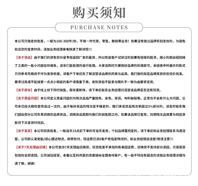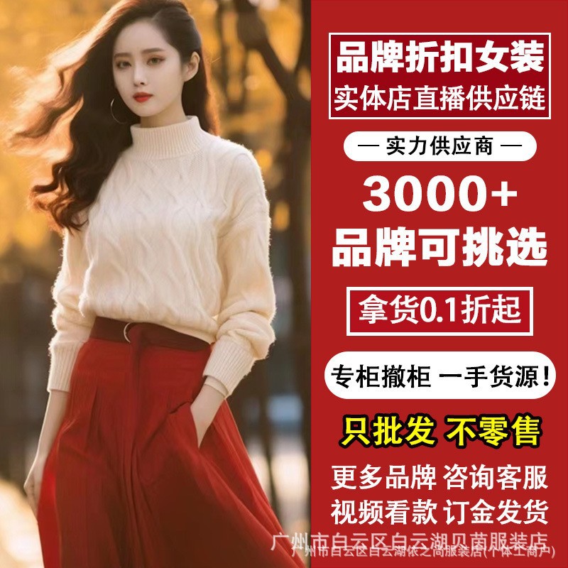 商品属性 [上市年份/季节] 2024年秋季 [包装方式] 单件单包装 [吊牌] 有吊牌 [商品季节] 春秋装 [商品库龄] 1年以内 [是否支持挑款] 否/随机配货 [款式包含] 外套,裤装,上衣,羽绒服,打底,毛衫,棉服,裙装,毛呢外套 [款式比例] 货品详情比例请咨询客服 [残次率] 3%以下 [看款方式] 直播间选款,旺旺发图片,旺旺发视频 [计价方式] 按单件计价 [货源类型] 国内一二线品牌 [超残次率处理] 包换,包退 [面料名称] 多种面料 [领标] 有领标