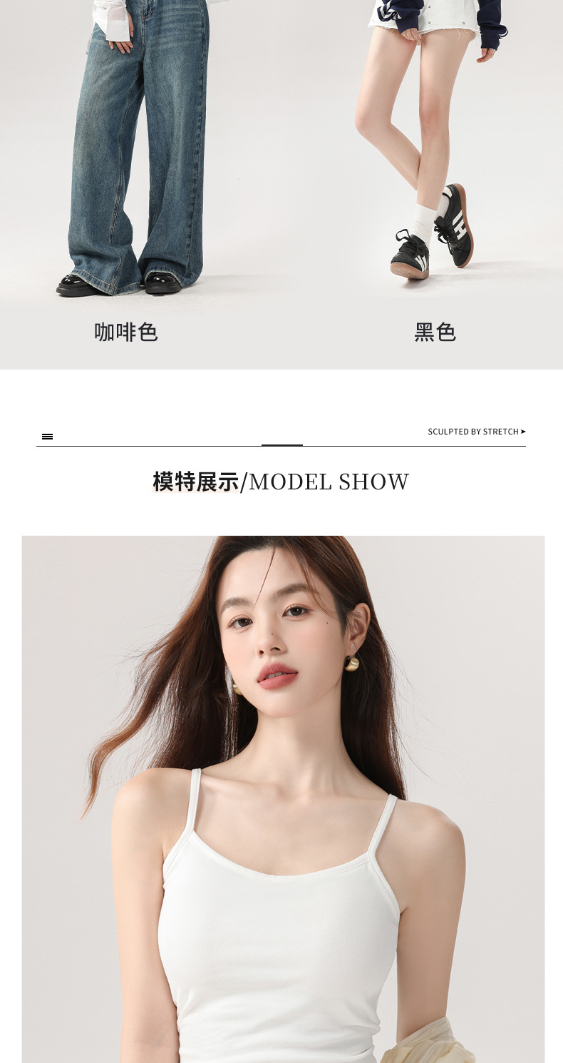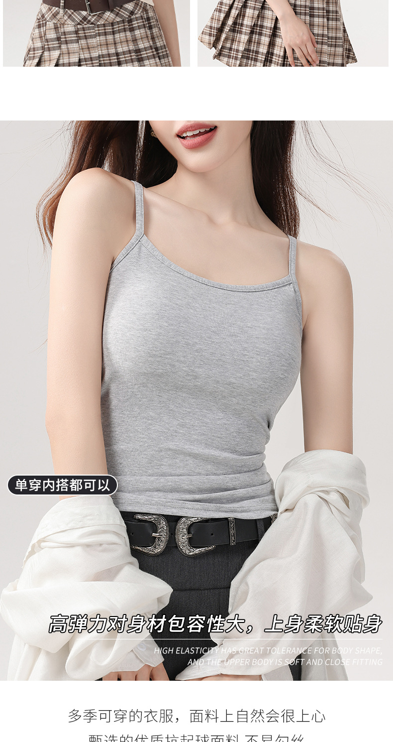 商品属性 [上市年份/季节] 2025年春季 [主面料成分] 棉 [主面料成分2] 氨纶 [主面料成分2含量] 30%以下 [主面料成分含量] 90%(含)-95%(不含) [图案] 纯色 [弹力] 高弹 [打底衫内衣] 防走光一体式打底衫内衣女 [是否跨境货源] 否 [款式] 吊带款 [流行元素] 纯色 [版型] 修身型 [绒布] 无痕吊带背心女 [肩带样式] 不可拆卸,单根式 [背心女] 春夏季内搭背心女 [衣长] 普通款(50cm<衣长≤65cm) [面料名称] 棉 [风格] 通勤风 [风格类型] 气质通勤