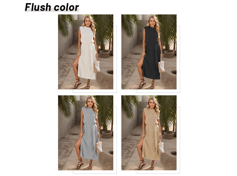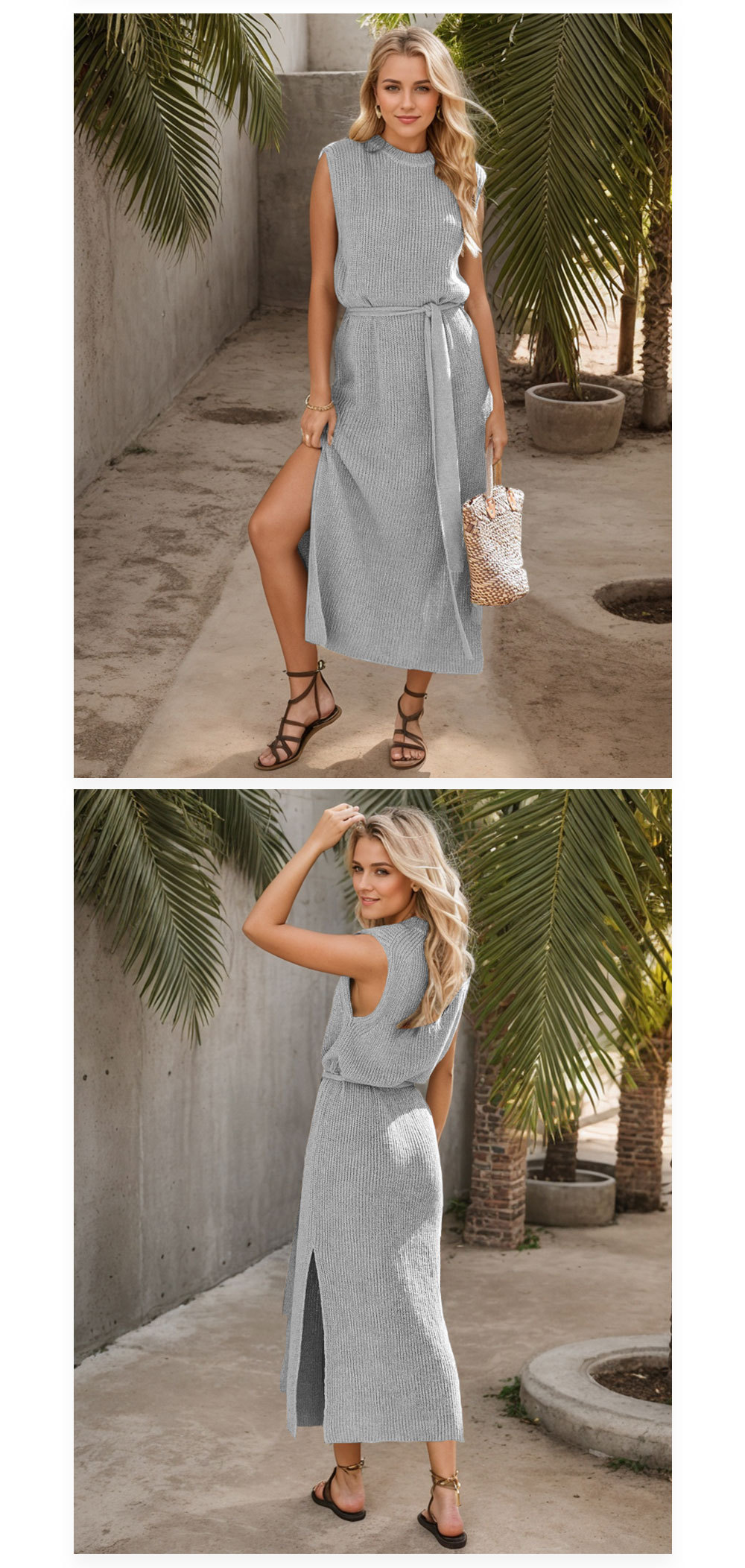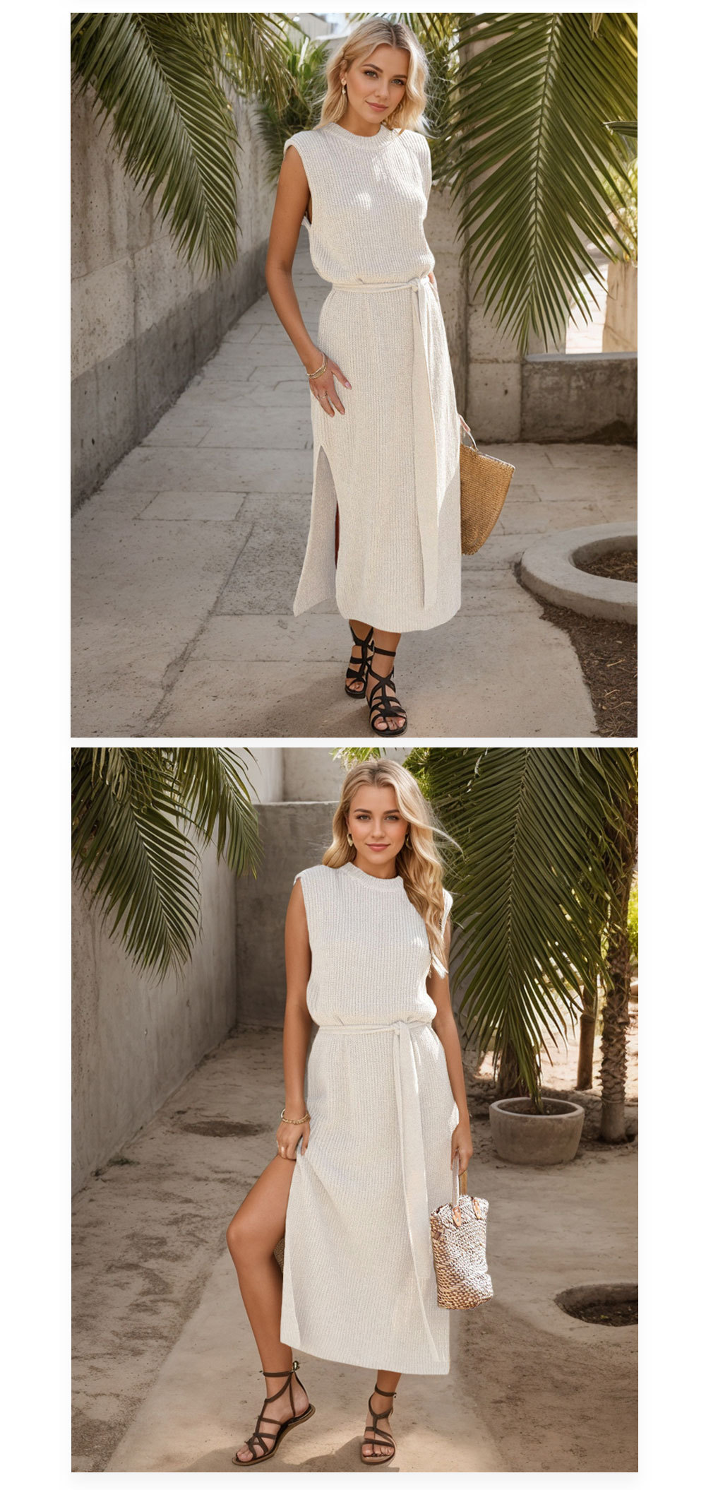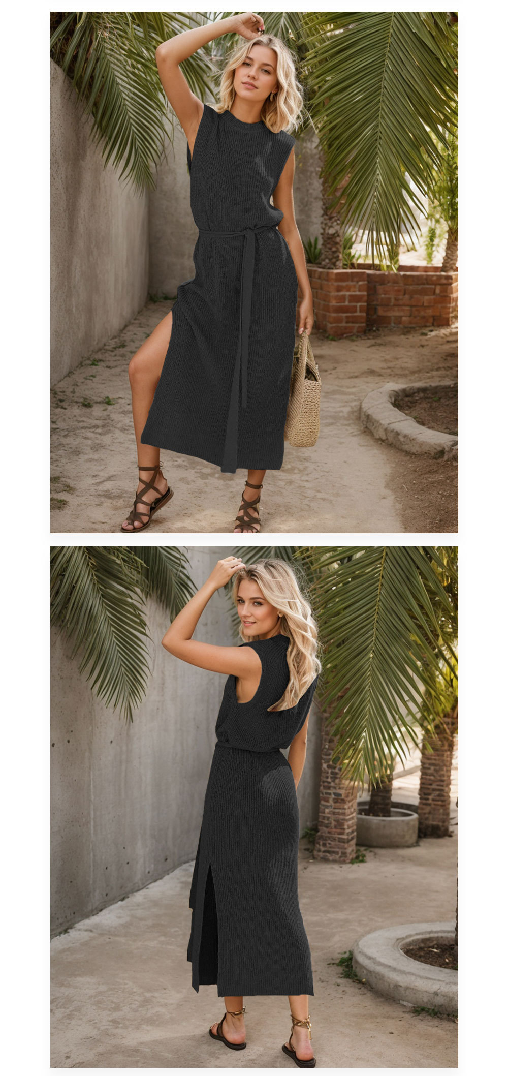 商品属性 [上市年份/季节] 2025夏季 [主要下游销售地区1] 欧美 [主要下游销售地区2] 欧美 [主面料成分] 腈纶 [主面料成分含量] 95%及以上 [产地] 汕头 [图案] 纯色 [工艺] 纯色 [是否跨境货源] 是 [款式] 套头 [流行元素] 开叉 [组合形式] 单件 [腰型] 宽松腰 [袖型] 无袖 [袖长] 无袖 [裙型] A字裙 [裙长] 长裙 [跨境风格类型] 个性街头 [门襟] 系带 [面料名称] 针织 [领型] 圆领 [风格] 欧美风 [风格类型] 街头潮人
