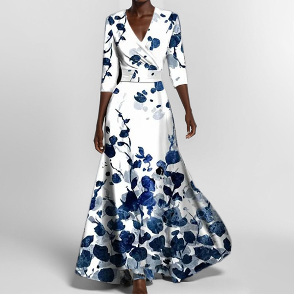 商品属性 [上市年份/季节] 2025年春季 [主要下游销售地区1] 欧美 [主要下游销售地区2] 欧美 [主面料成分] 涤纶(聚酯纤维) [主面料成分含量] 95%及以上 [产地] 中国 [图案] 印花 [工艺] 印花 [是否跨境货源] 是 [款式] 套头款 [流行元素] 印花 [组合形式] 单件 [腰型] 高腰 [袖型] 常规袖 [袖长] 七分袖 [裙型] A字裙 [裙长] 长裙 [跨境风格类型] 气质优雅 [门襟] 套头 [面料名称] 涤纶 [领型] V字领 [风格] 通勤风 [风格类型] 气质通勤