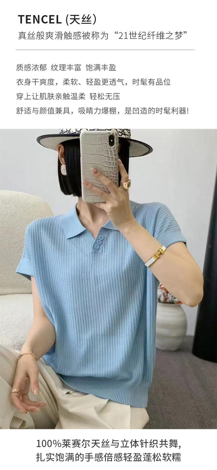 商品属性 [上市年份/季节] 2025夏季 [主要下游销售地区1] 欧美 [主要下游销售地区2] 中东 [主面料成分] 天丝(莱赛尔纤维) [主面料成分含量] 95%及以上 [图案] 条纹/格子 [工艺] 树脂固色 [是否跨境货源] 是 [款式] 套头 [流行元素] 螺纹 [版型] 常规 [衣长] 普通款(50cm<衣长≤65cm) [袖型] 常规袖 [袖长] 短袖 [跨境风格类型] 舒适休闲 [面料名称] 天丝 [领型] POLO领 [风格] 通勤风 [风格类型] 气质通勤