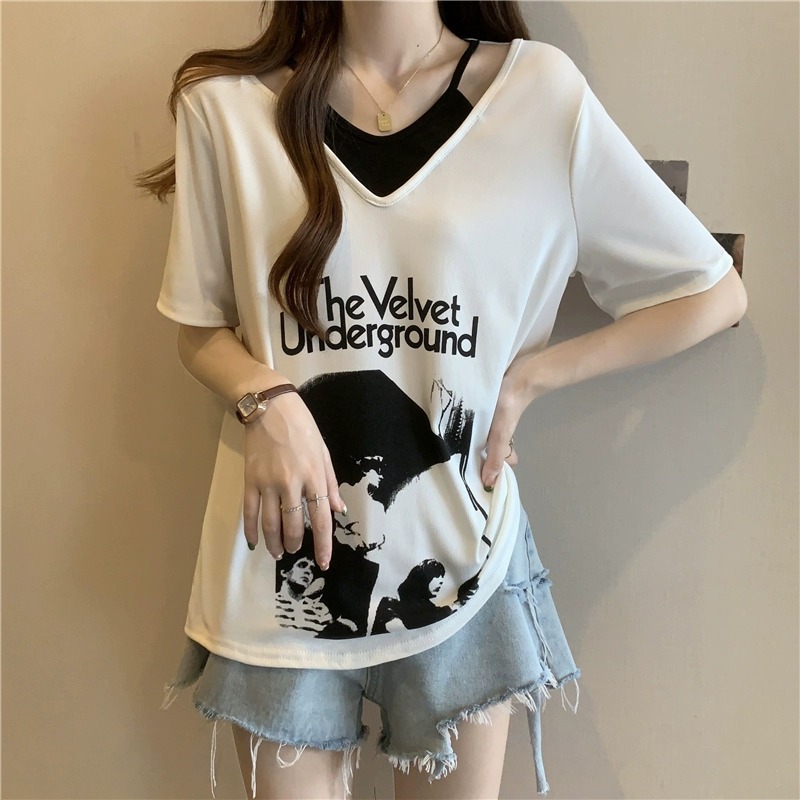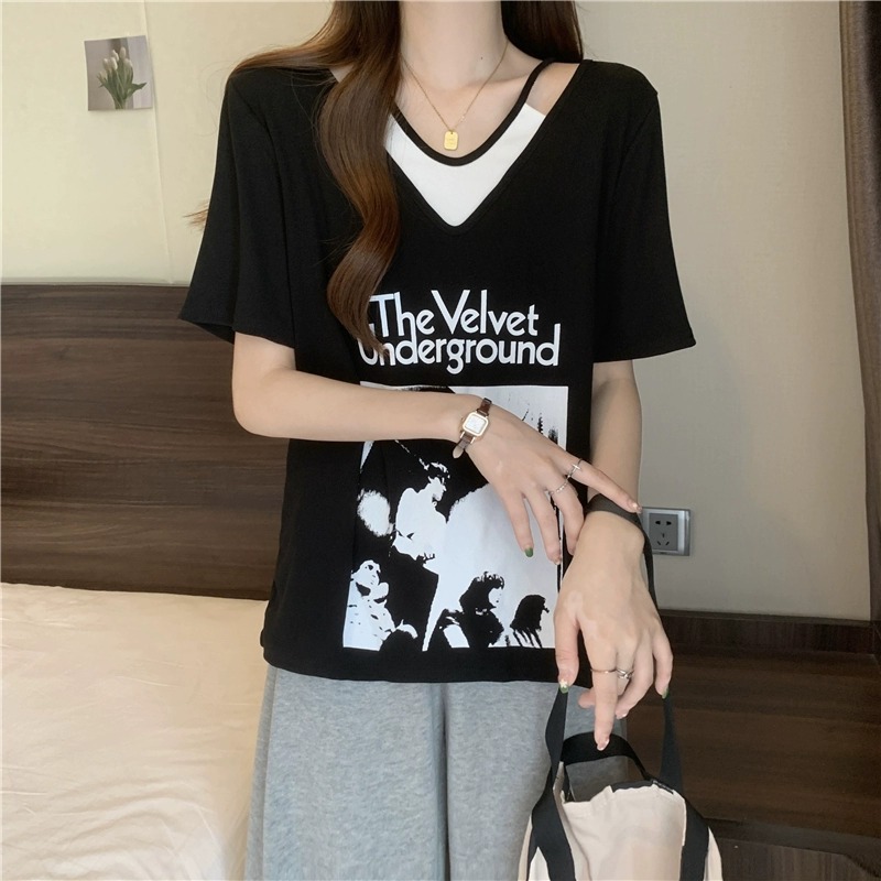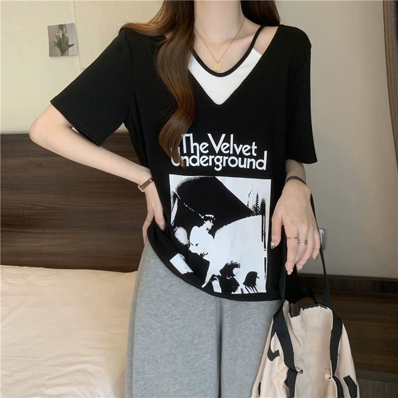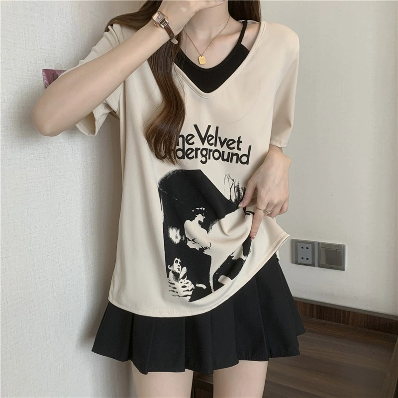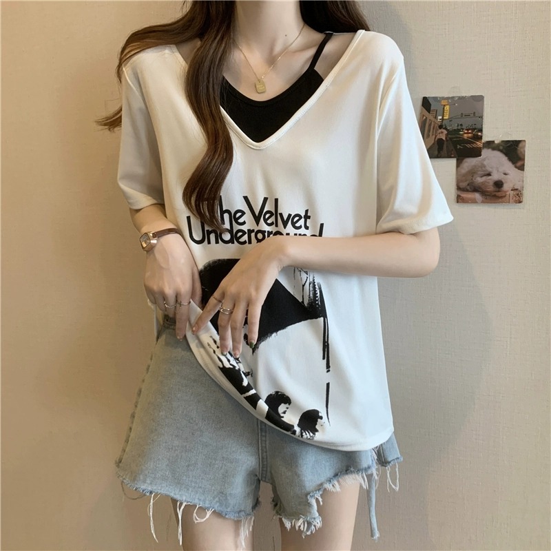 商品属性 [上市年份/季节] 2024年夏季 [主要下游销售地区1] 东南亚 [主要下游销售地区2] 欧美 [主面料成分] 涤纶(聚酯纤维) [主面料成分含量] 95%及以上 [图案] 几何图案 [工艺] 拼贴/拼接 [是否跨境货源] 是 [款式] 假两件套 [流行元素] 系带 [版型] 宽松型 [衣长] 普通款(50cm<衣长≤65cm) [袖型] 常规袖 [袖长] 短袖 [跨境风格类型] 甜美清新 [面料名称] 涤纶 [领型] V字领 [风格] 甜美风 [风格类型] 清新甜美