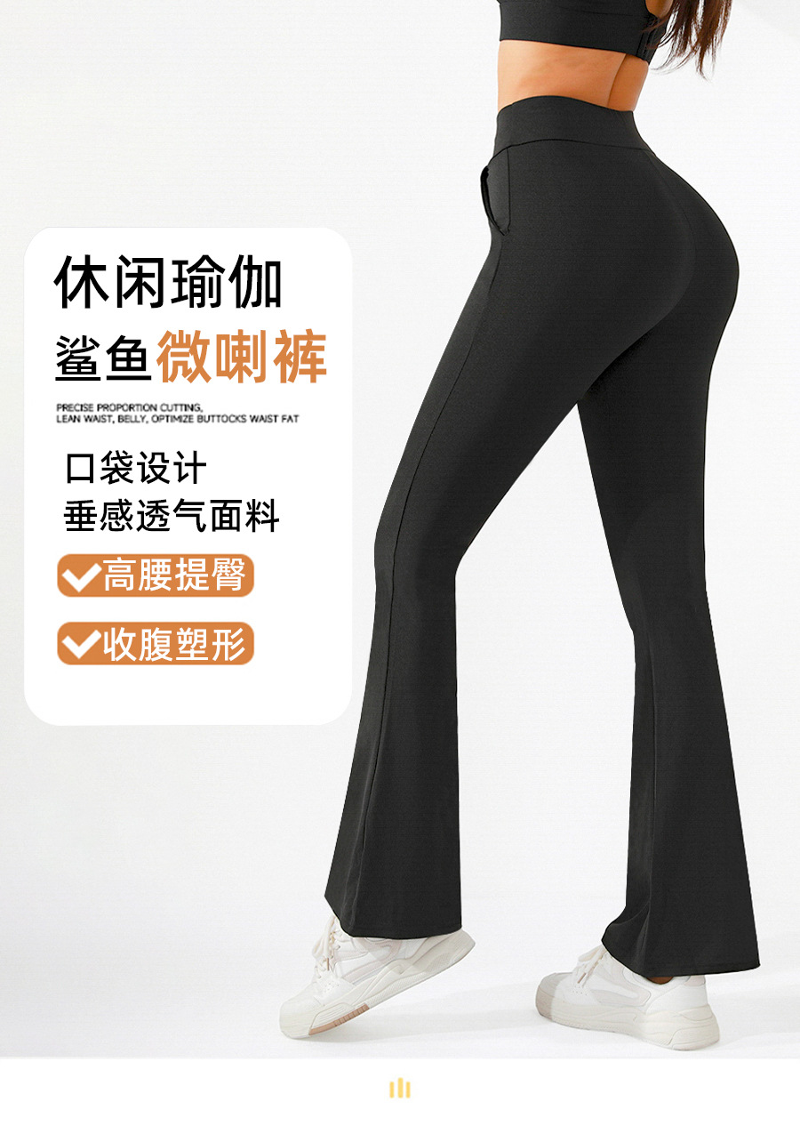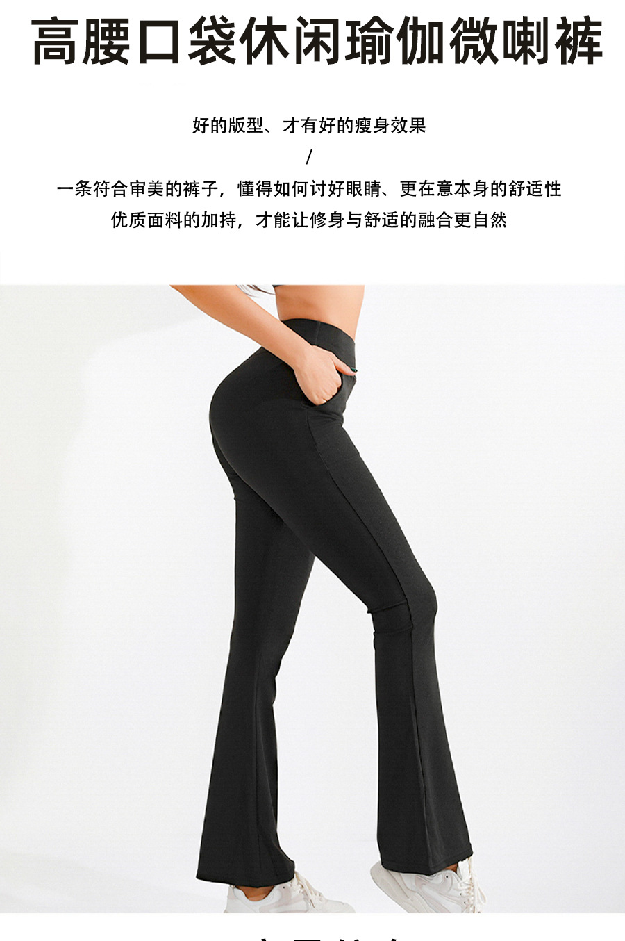 商品属性 [上市年份/季节] 2025夏季 [主要下游销售地区1] 欧美 [主要下游销售地区2] 中东、非洲、北美、南美、欧洲、西欧、东欧 [主面料成分] 涤纶(聚酯纤维) [主面料成分2] 氨纶 [主面料成分2含量] 30%以下 [主面料成分含量] 90%(含)-95%(不含) [厚薄] 薄 [工艺] 拼贴/拼接 [弹力] 中弹 [是否跨境货源] 是 [款式] 基本款 [流行元素] 口袋 [腰型] 高腰 [裤型] 微喇型 [裤长] 长裤 [跨境风格类型] 舒适休闲 [面料名称] 涤纶 [风格] 通勤风 [风格类型] 气质通勤
