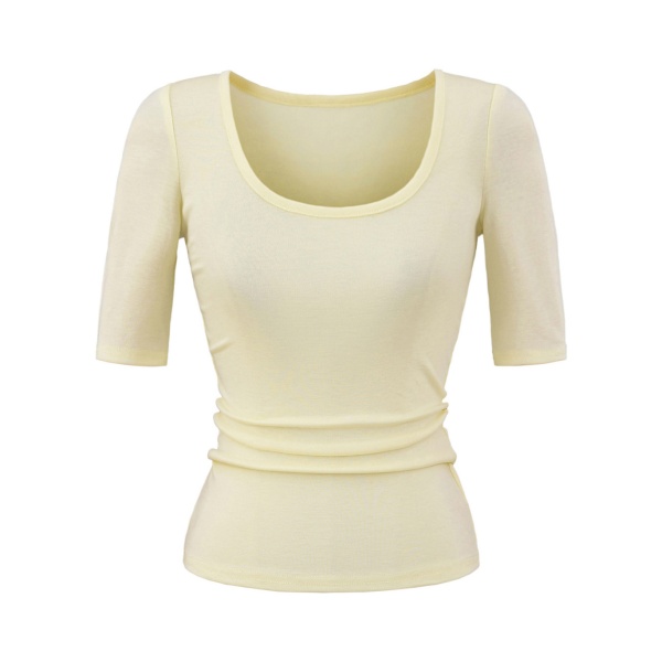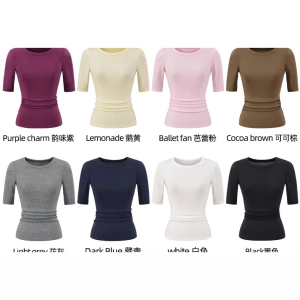 商品属性 [上市年份/季节] 2025夏季 [主要下游销售地区1] 欧美 [主要下游销售地区2] 欧美 [主面料成分] 天丝(莱赛尔纤维) [主面料成分2] 氨纶 [主面料成分2含量] 30%以下 [主面料成分含量] 90%(含)-95%(不含) [图案] 纯色 [工艺] 高温定型 [是否跨境货源] 是 [款式] 套头 [流行元素] 修身 [版型] 常规 [衣长] 普通款(50cm<衣长≤65cm) [袖型] 常规袖 [袖长] 五分袖 [跨境风格类型] 性感辣妹 [面料名称] 针织 [领型] 圆领 [风格] 甜辣风 [风格类型] 私服名媛