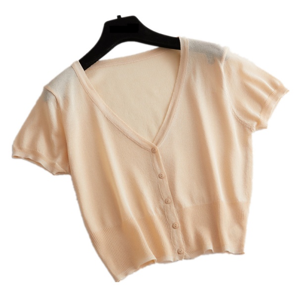 商品属性 [上市年份/季节] 2025夏季 [主面料成分的含量] 71%-80% [厚薄] 超薄 [图案] 纯色 [是否跨境货源] 否 [款式] 开衫 [版型] 直筒型 [袖型] 常规袖 [袖长] 三分袖 [门襟] 单排多扣 [面料名称] 粘胶 [领型] V字领 [风格] 甜美风 [风格类型] 清新甜美