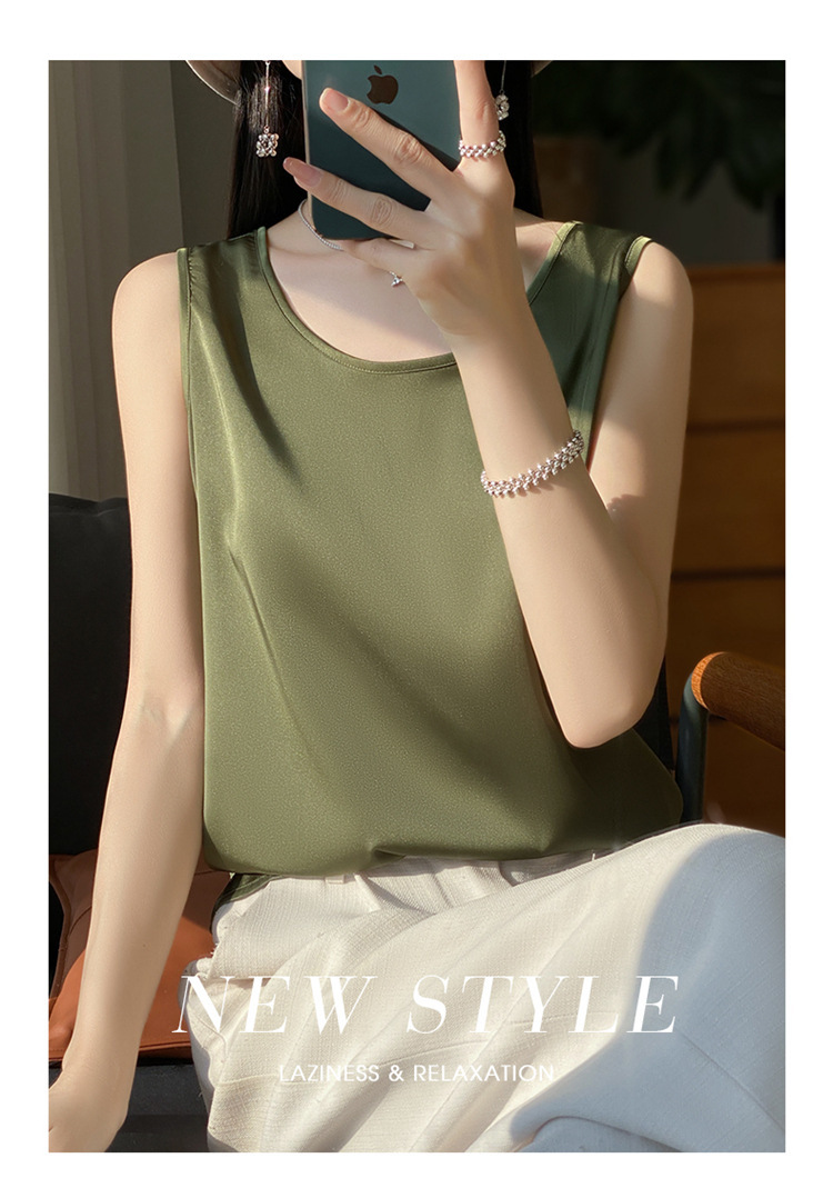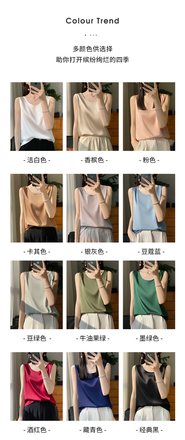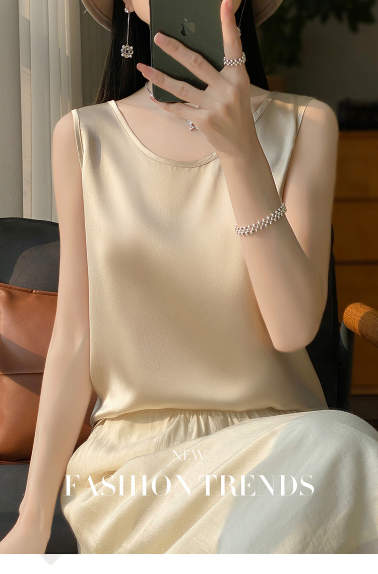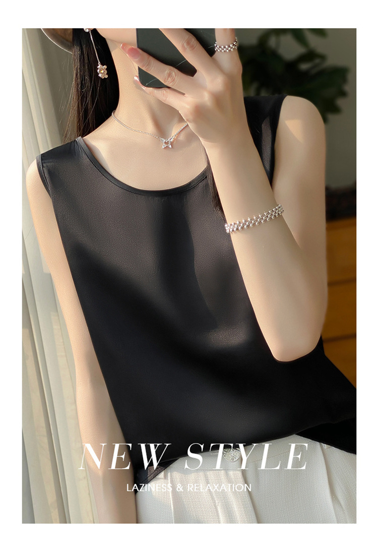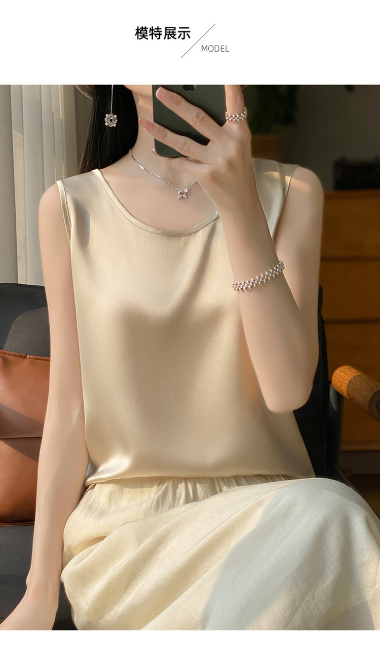 缎面真丝2024春夏季新款女套头短款上衣无袖背心圆领吊带纯色内搭
