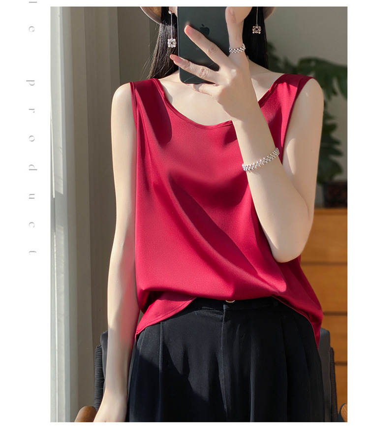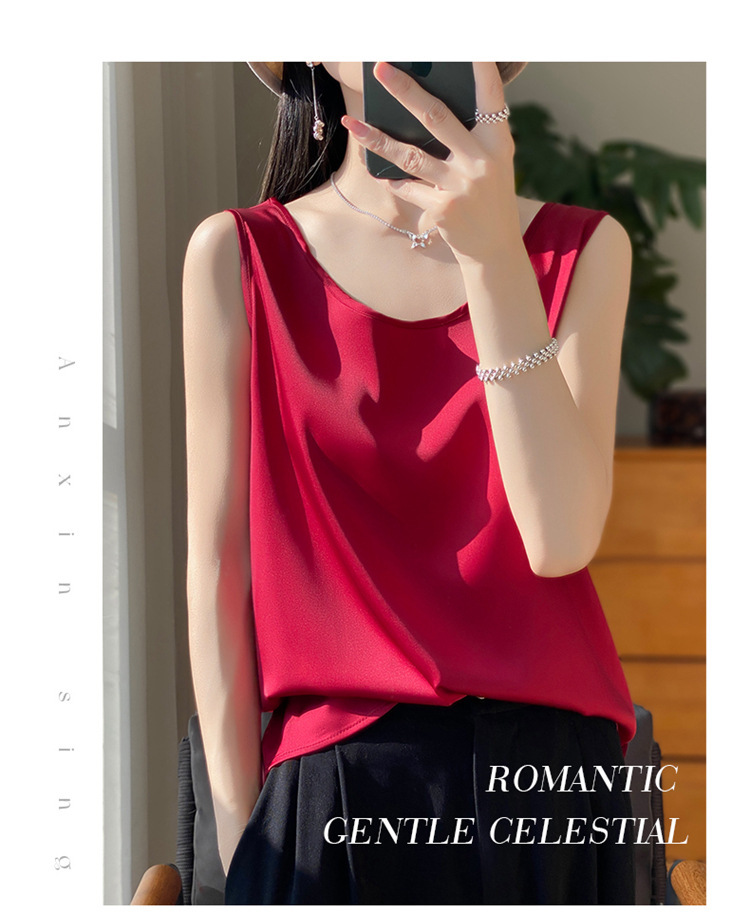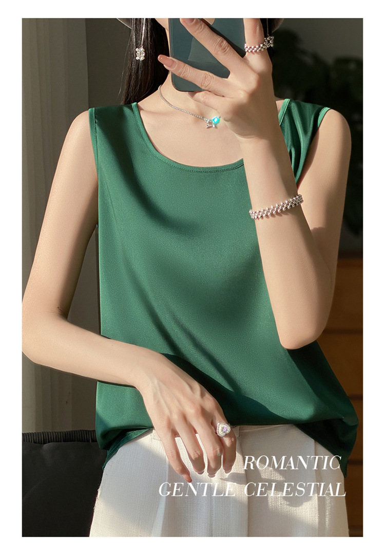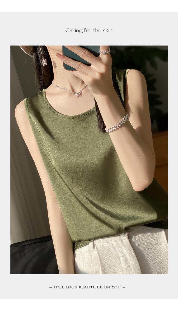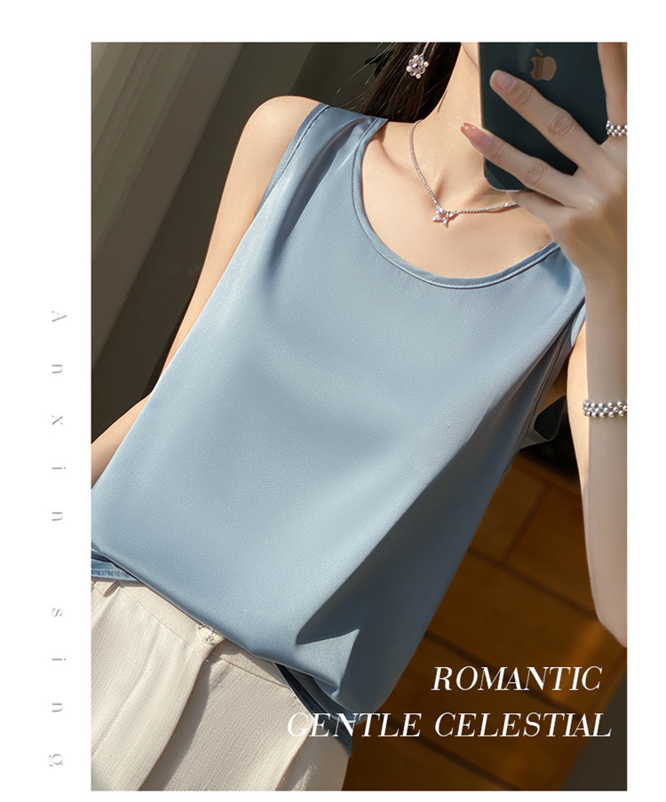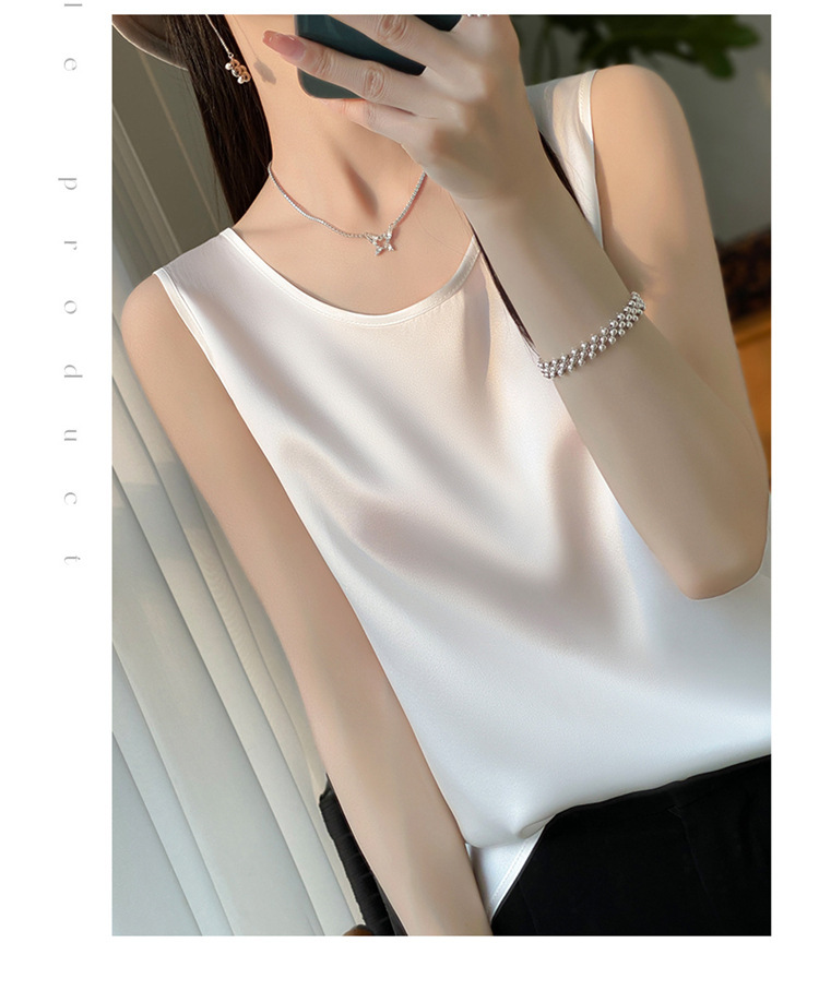 缎面真丝2024春夏季新款女套头短款上衣无袖背心圆领吊带纯色内搭
