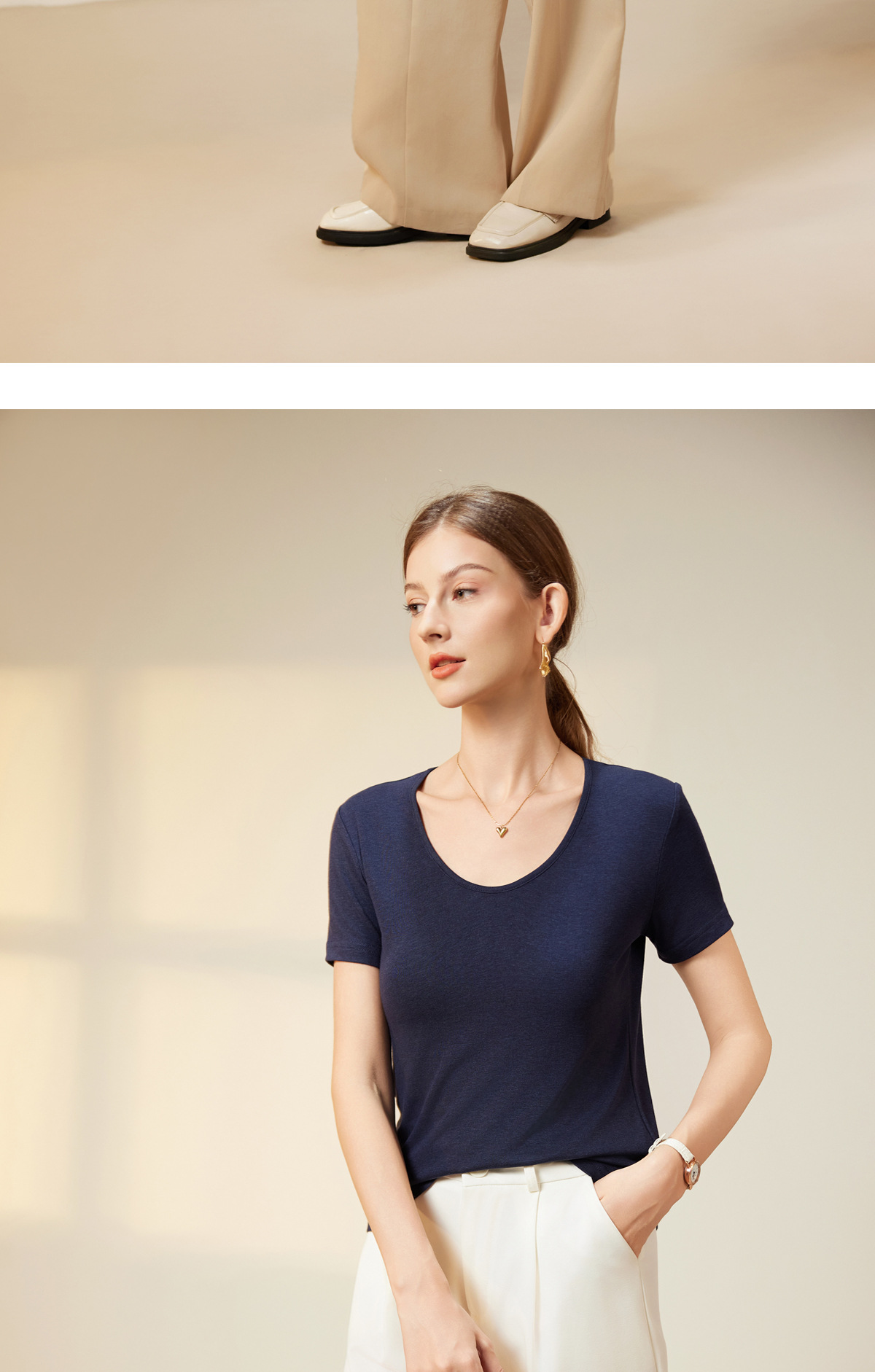 商品属性 [上市年份/季节] 2025年春季 [主面料成分] 莱赛尔天丝 [主面料成分2] 腈纶 [主面料成分2含量] 30%(含)-50%(不含) [主面料成分含量] 30%(含)-50%(不含) [图案] 纯色 [工艺] 拼贴/拼接 [是否跨境货源] 否 [款式] 套头 [版型] 修身型 [衣长] 普通款(50cm<衣长≤65cm) [袖型] 常规袖 [袖长] 短袖 [面料名称] 莱赛尔 [领型] V字领 [风格] 都市风 [风格类型] 气质通勤