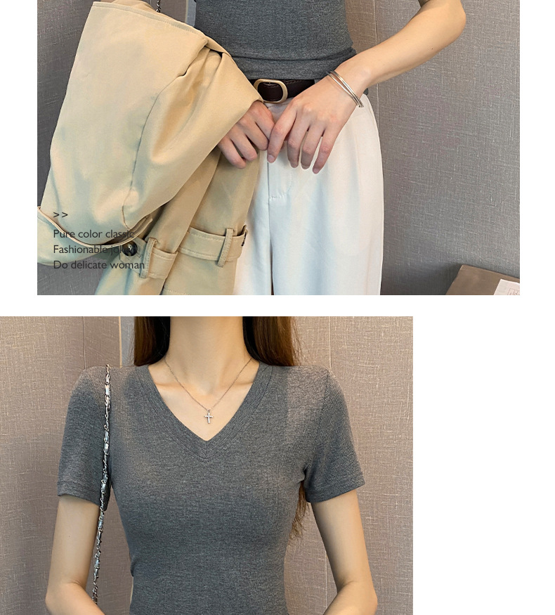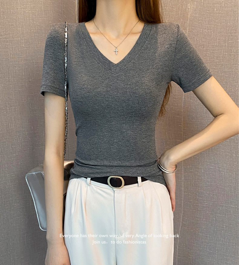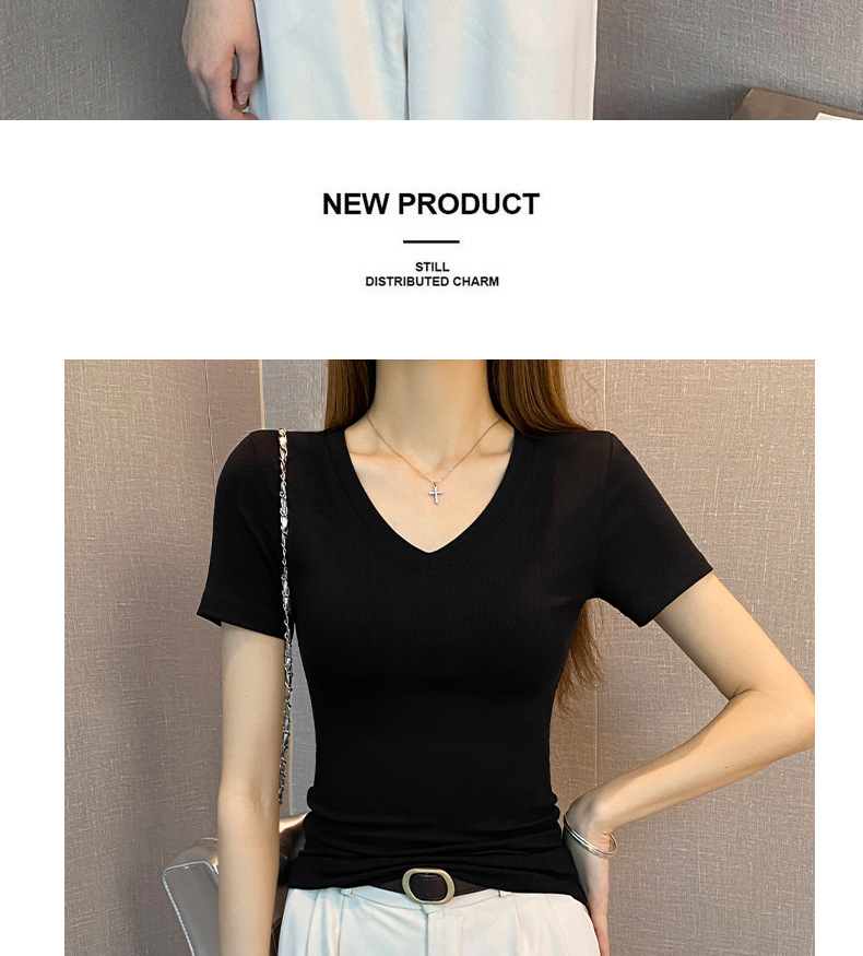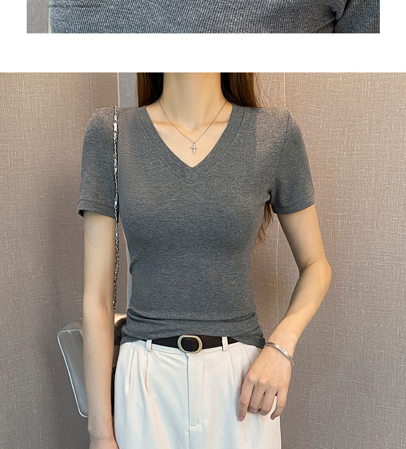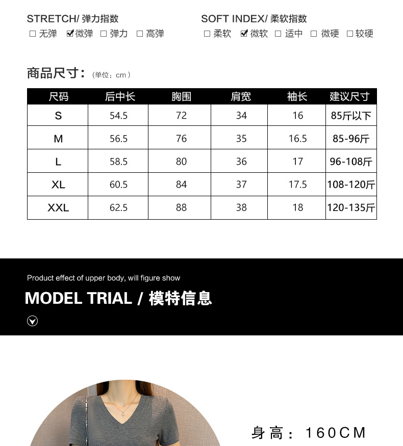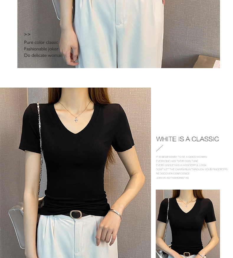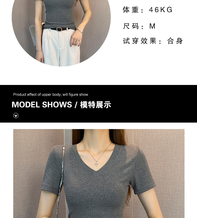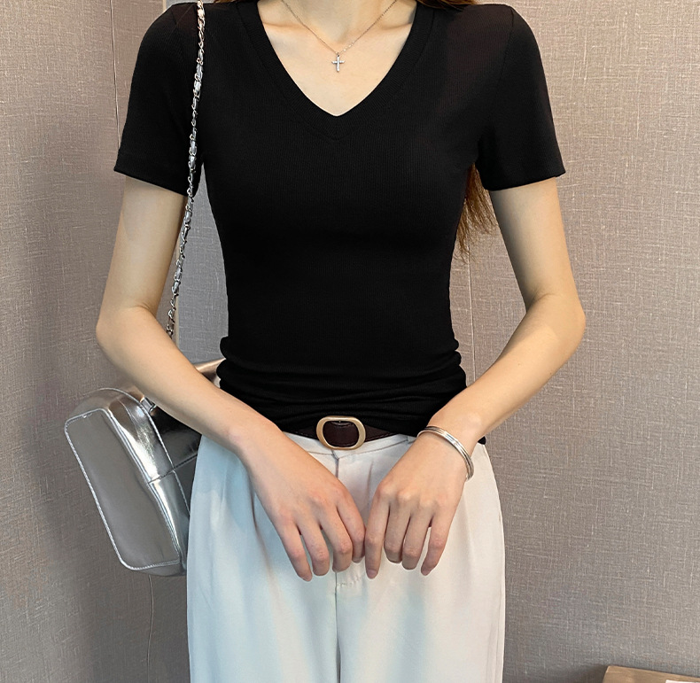 商品属性 [上市年份/季节] 2025年春季 [主面料成分] 粘胶纤维 [主面料成分含量] 95%及以上 [图案] 纯色 [是否跨境货源] 否 [版型] 修身型 [袖型] 常规袖 [袖长] 短袖 [面料名称] 粘胶纤维 [领型] V领 [风格] 通勤风 [风格类型] 气质通勤