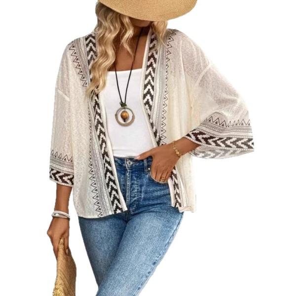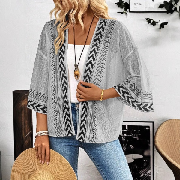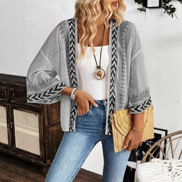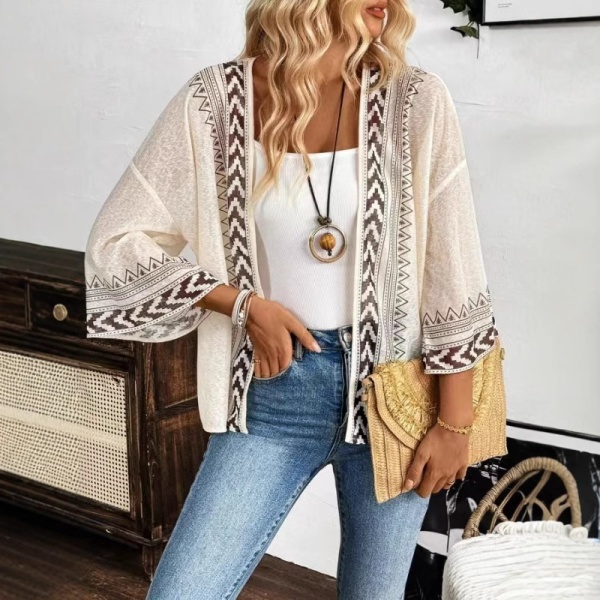 商品属性 [上市年份/季节] 2025年春季 [主面料成分] 再生纤维素纤维 [主面料成分2] 再生纤维素纤维 [主面料成分2含量] 30%以下 [主面料成分含量] 50%(含)-70%(不含) [图案] 印花 [工艺] 印花 [是否跨境货源] 否 [款式] 开衫 [流行元素] 印花 [版型] 宽松型 [衣长] 普通款(50cm<衣长≤65cm) [袖型] 常规袖 [袖长] 七分袖 [面料名称] 氨纶 [领型] 半开领 [风格] 优雅风 [风格类型] 气质通勤