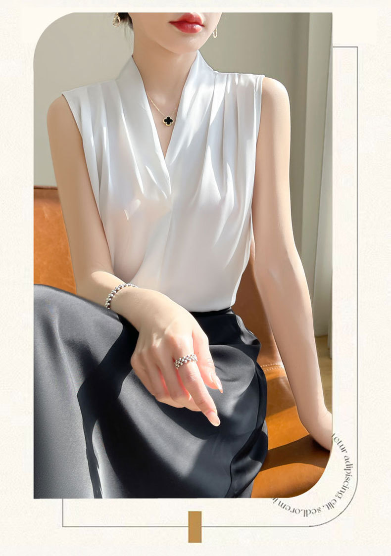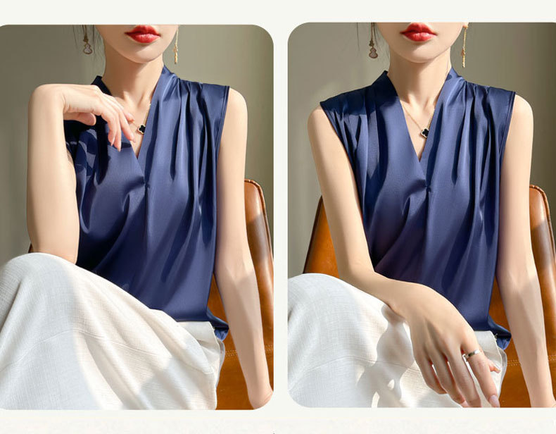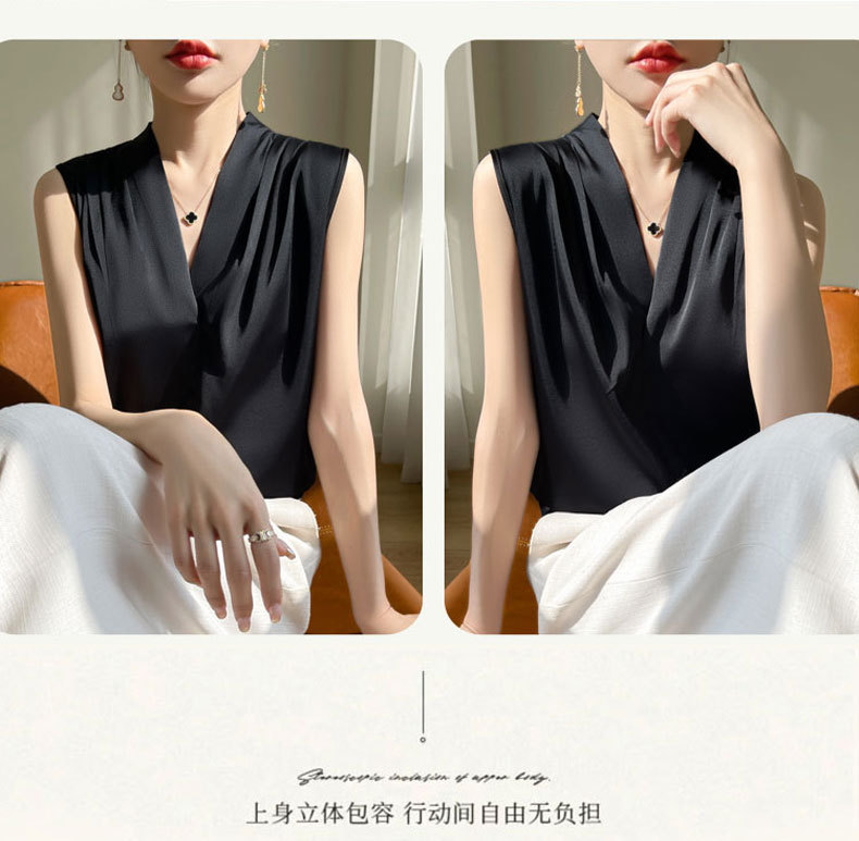 商品属性 [上市年份/季节] 2024年夏季 [主要下游销售地区1] 欧美 [主要下游销售地区2] 中东 [主面料成分] 涤纶(聚酯纤维) [主面料成分2] 氨纶 [主面料成分2含量] 30%以下 [主面料成分含量] 50%(含)-70%(不含) [图案] 纯色 [弹力] 微弹 [是否跨境货源] 是 [款式] 套头 [流行元素] 褶皱 [版型] 常规 [肩带样式] 挂脖肩带,不可拆卸 [衣长] 普通款(50cm<衣长≤65cm) [跨境风格类型] 气质优雅 [面料名称] 仿真丝 [风格] 优雅风 [风格类型] 气质通勤